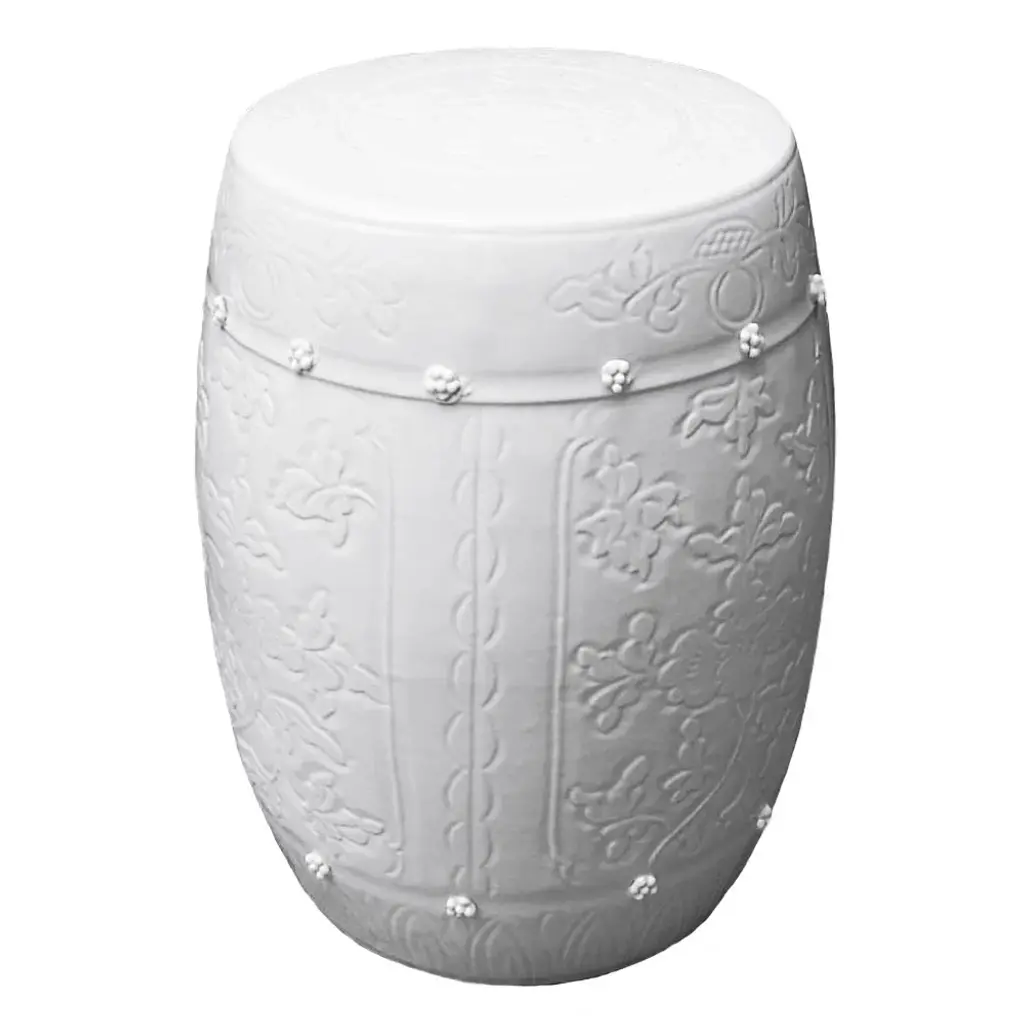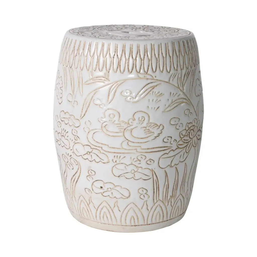 This Matte White Carved Mandarin Duck Garden Stool by Legends of Asia is perfect for a garden, patio, deck, sunroom, greenhouse or anywhere in your home that you want to add a fresh accent.