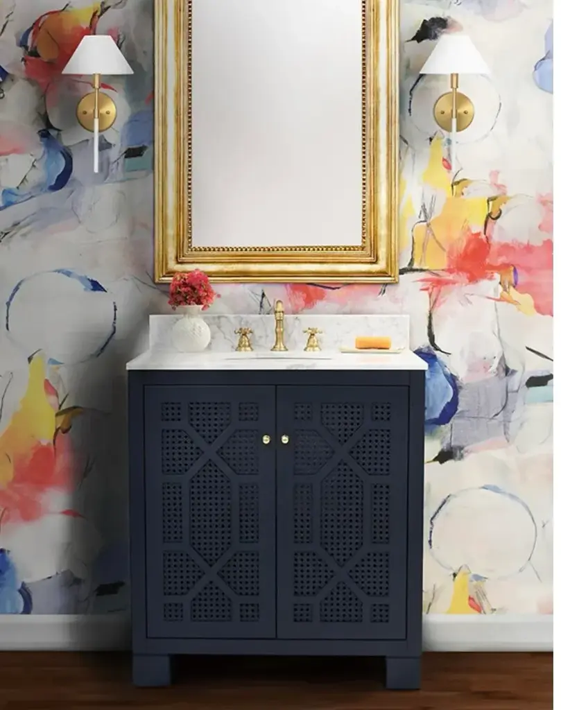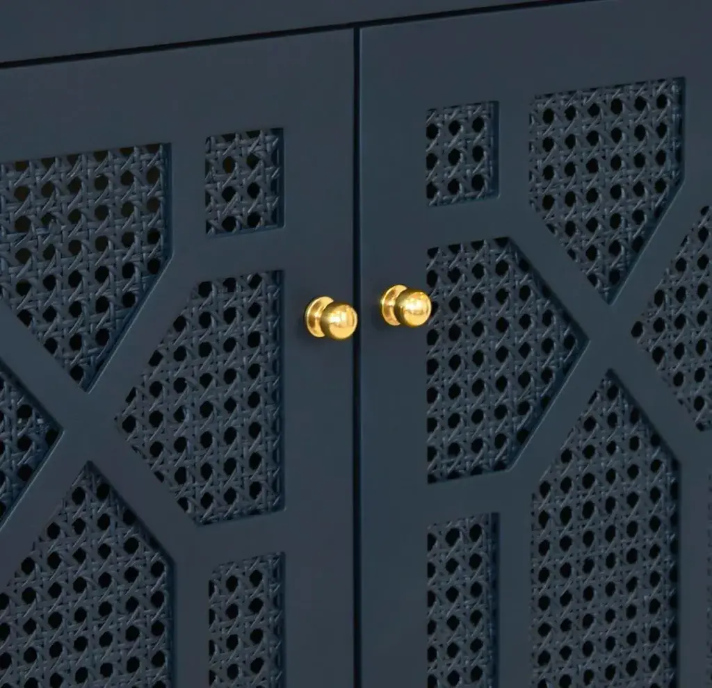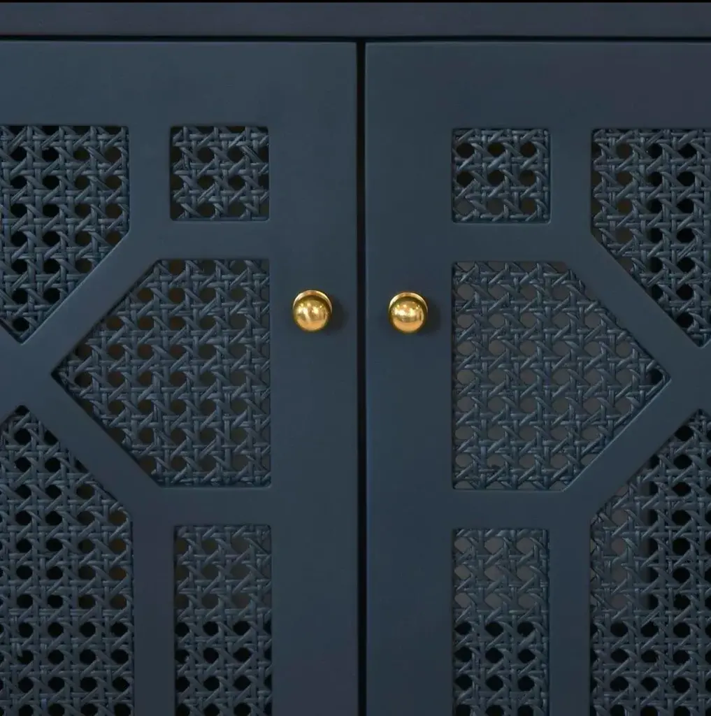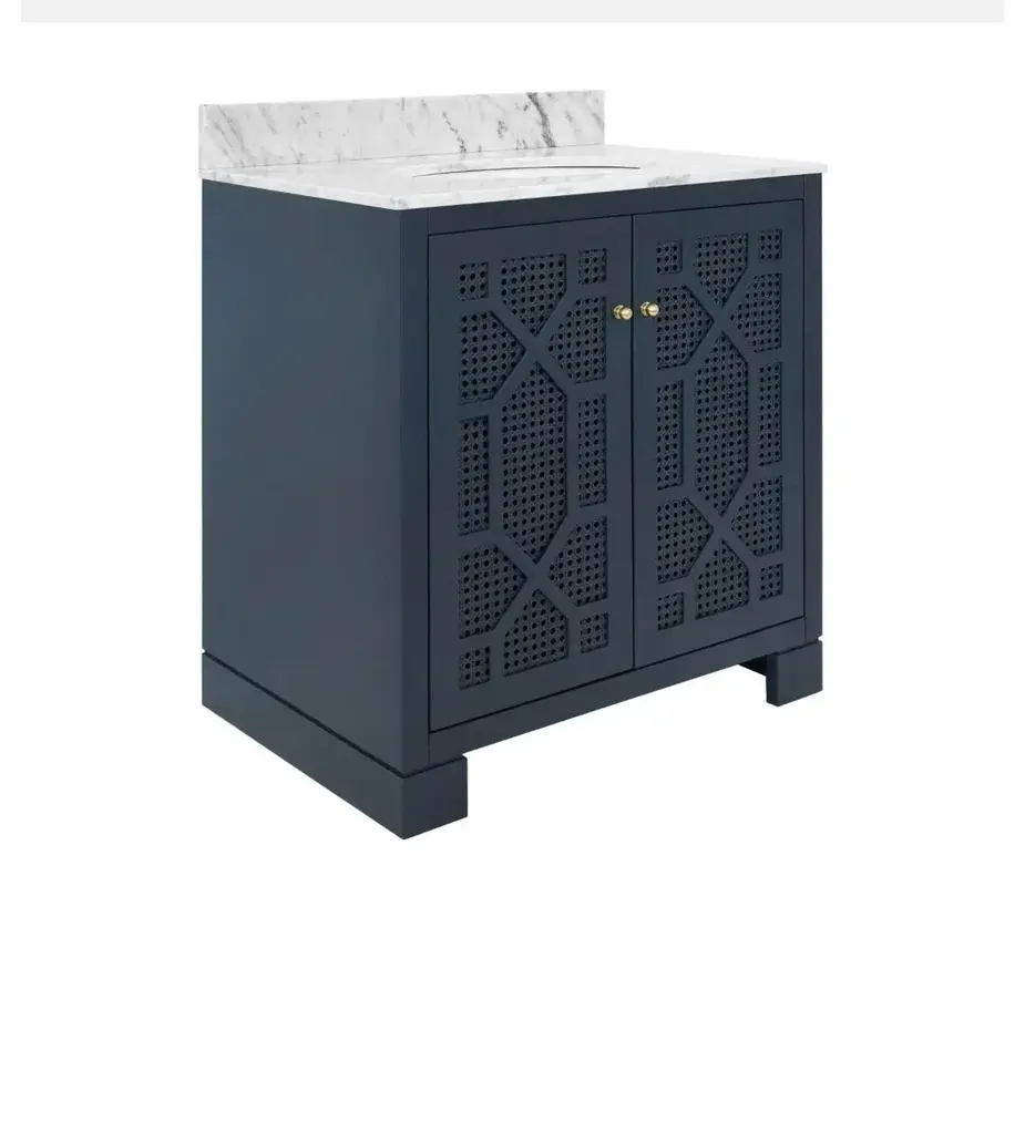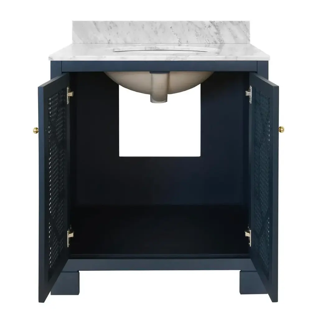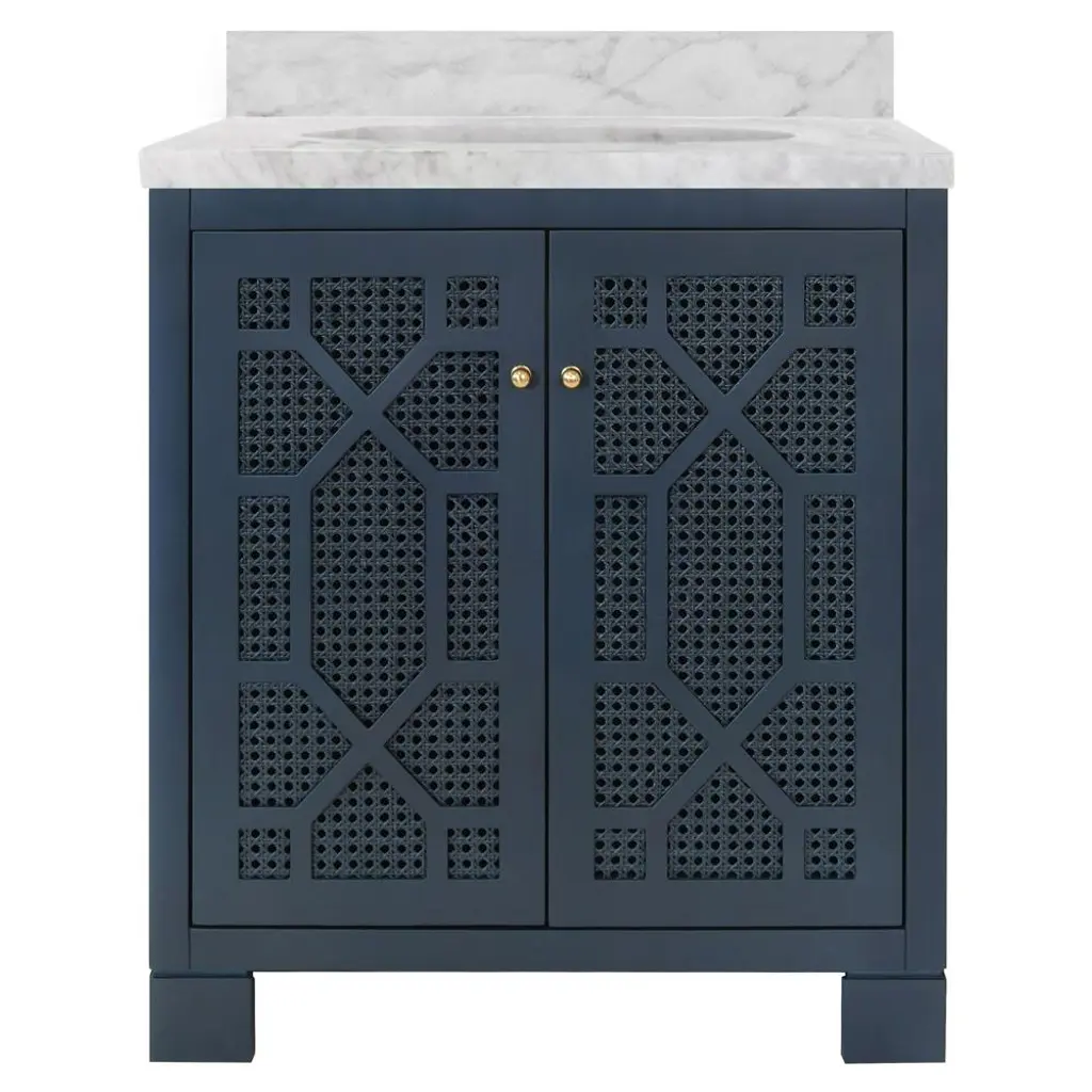 Celebrate sophistication and craftsmanship with the exquisite Schaffer NVY bath vanity! Finished in a timeless matte navy lacquer, the vanity showcases handwoven cane door fronts, white Carrara marble top, porcelain sink, and polished brass knobs. Each detail complements the other in a cohesive yet refined way. The Schaffer NVY is a standout! BACKSPLASH IS 4" HIGH, FULL WIDTH OF PRODUCT. INCLUDED BUT NOT ATTACHED FOR USE WITH 8" WIDESPREAD FAUCET (NOT INCLUDED) *Cane has natural variations and may differ slightly between panels. 30.5" W x 34.25" H x 21.63" D