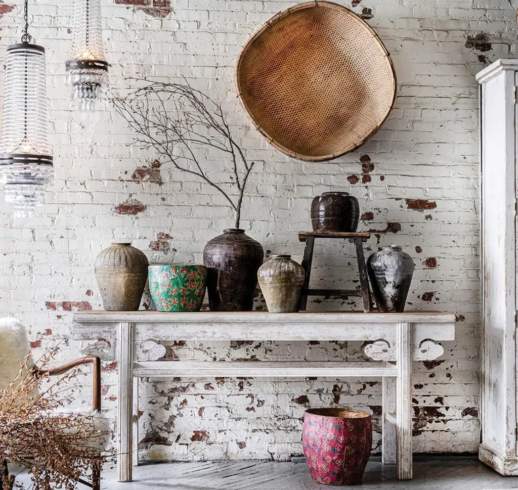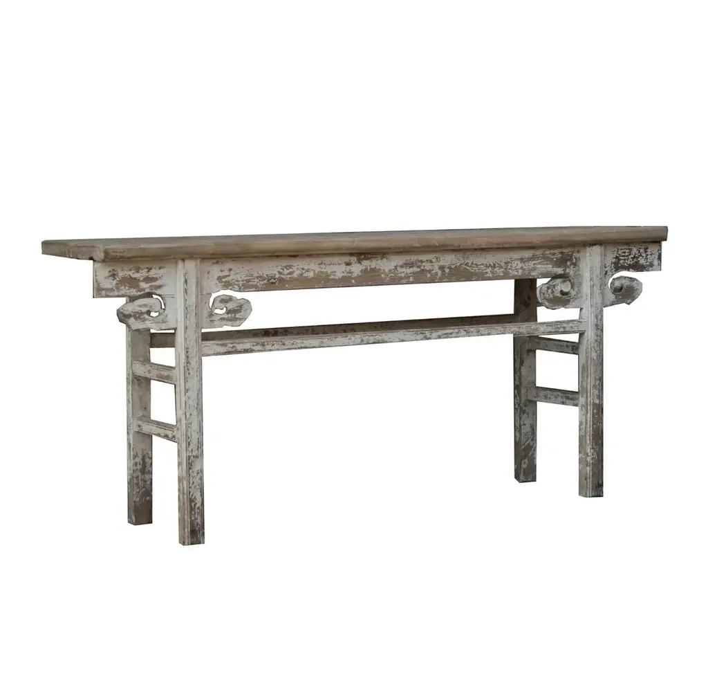 Using traditional Chinese architecture as an influence, the Floating Cloud Console is crafted from upcycled wood and adorned with hand-carved wood detail that resembles clouds. The tabletop is sanded smooth and lightly finished to enhance the raw look. The legs are white washed for a vintage charm.