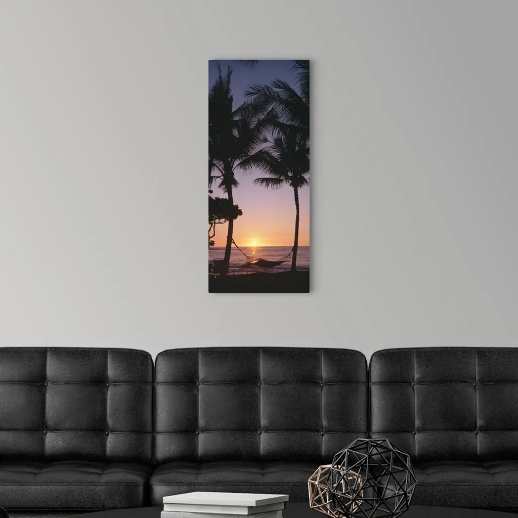 Vertical panoramic of two tall palm trees with hammock on beach at sunset.