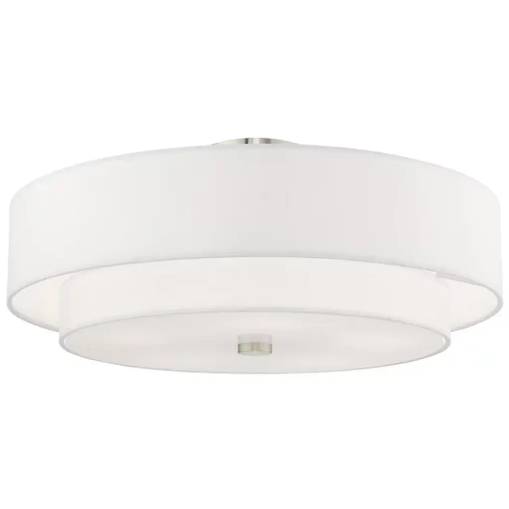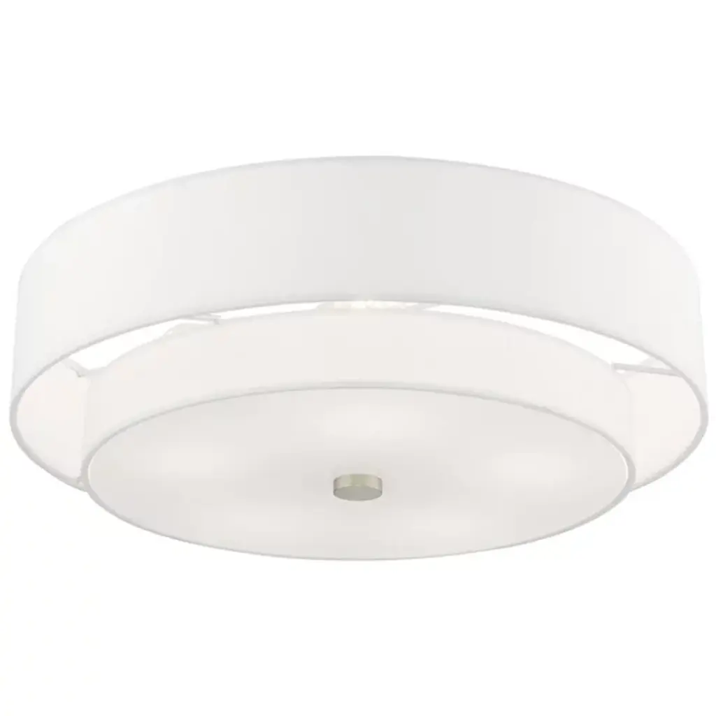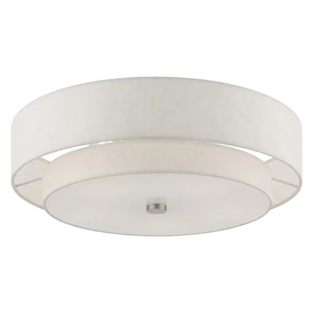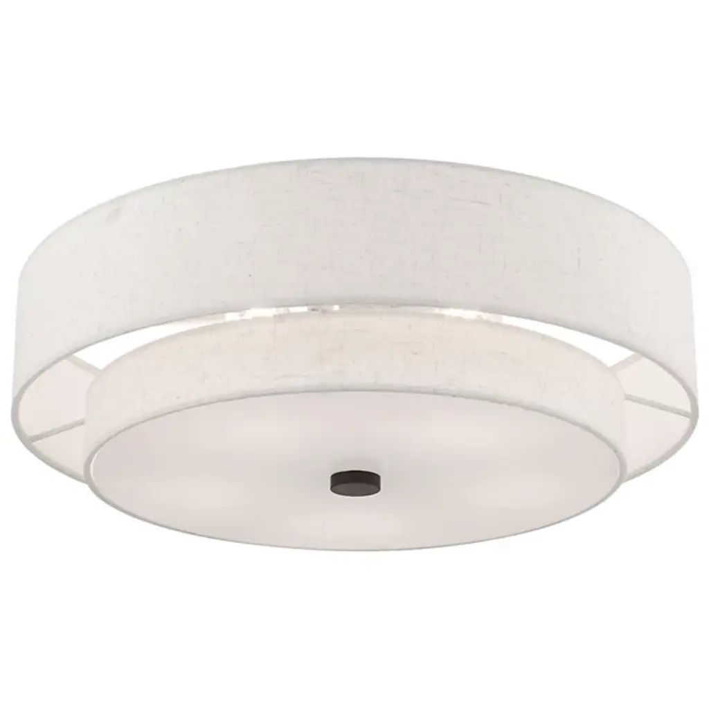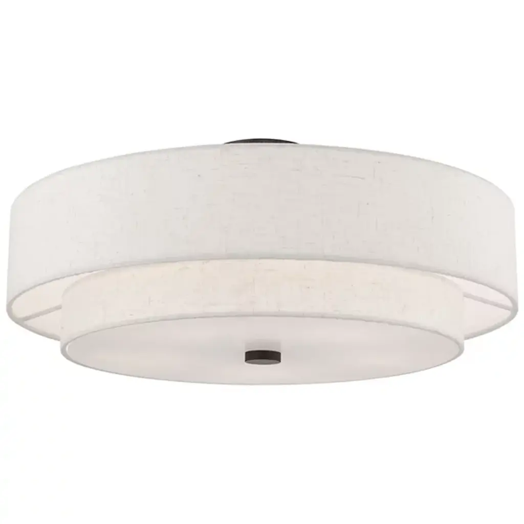 A concentric design with mesmerizing results. The Maureen Double Shade Semi Flushmount from Alder & Ore adds a stately transitional character to the home in its pairing of handcrafted shades. The piece sits close to the ceiling for an enhanced architectural look. Its steel mounting hardware delivers a sophisticated accent through a sleek finish. Both handmade, hardback fabric shades reach out in generous deep-dish forms. Together with a diffuser plate at the bottom, the dual shades present light with a soft, glare-free quality. The scale of the piece translates to a generous, atmospheric glow.