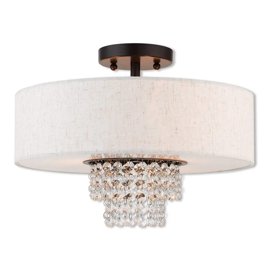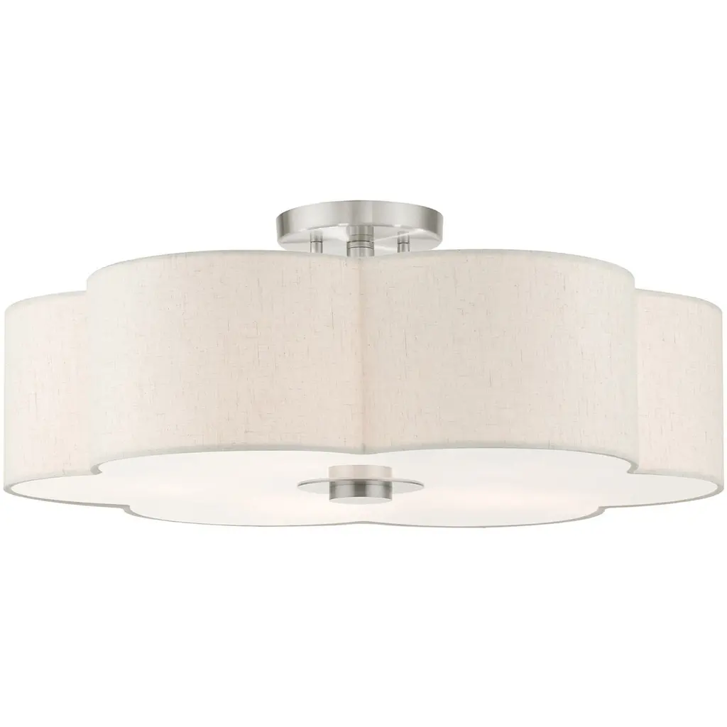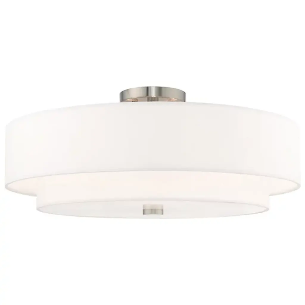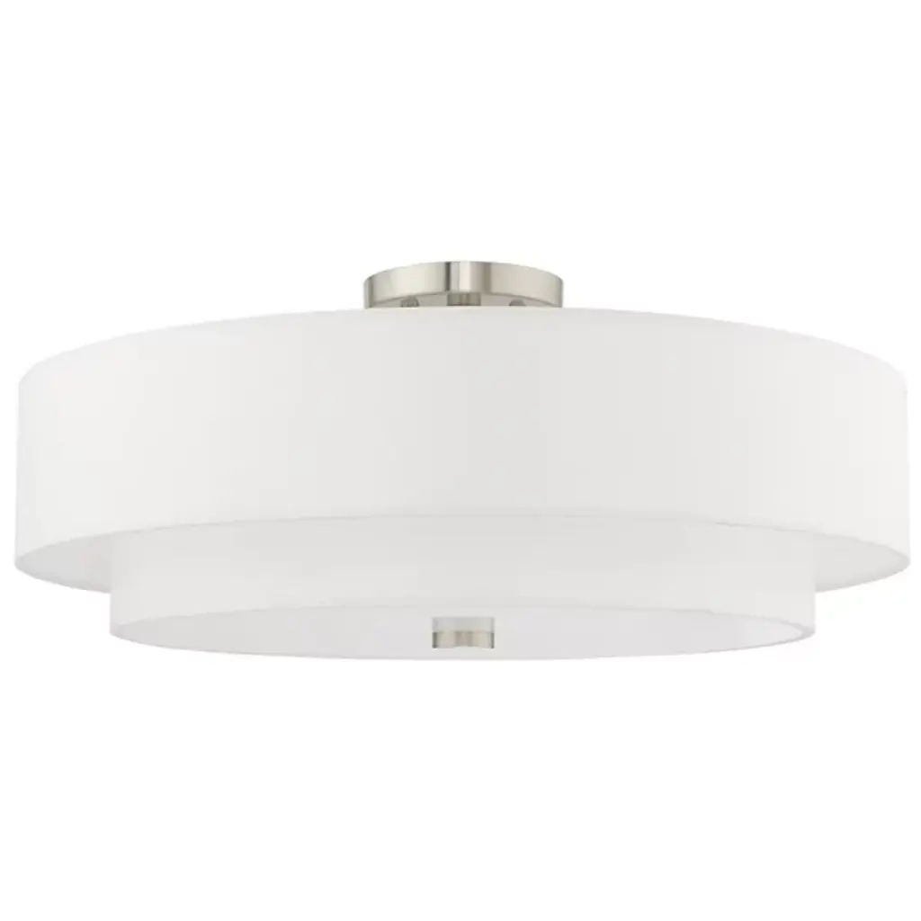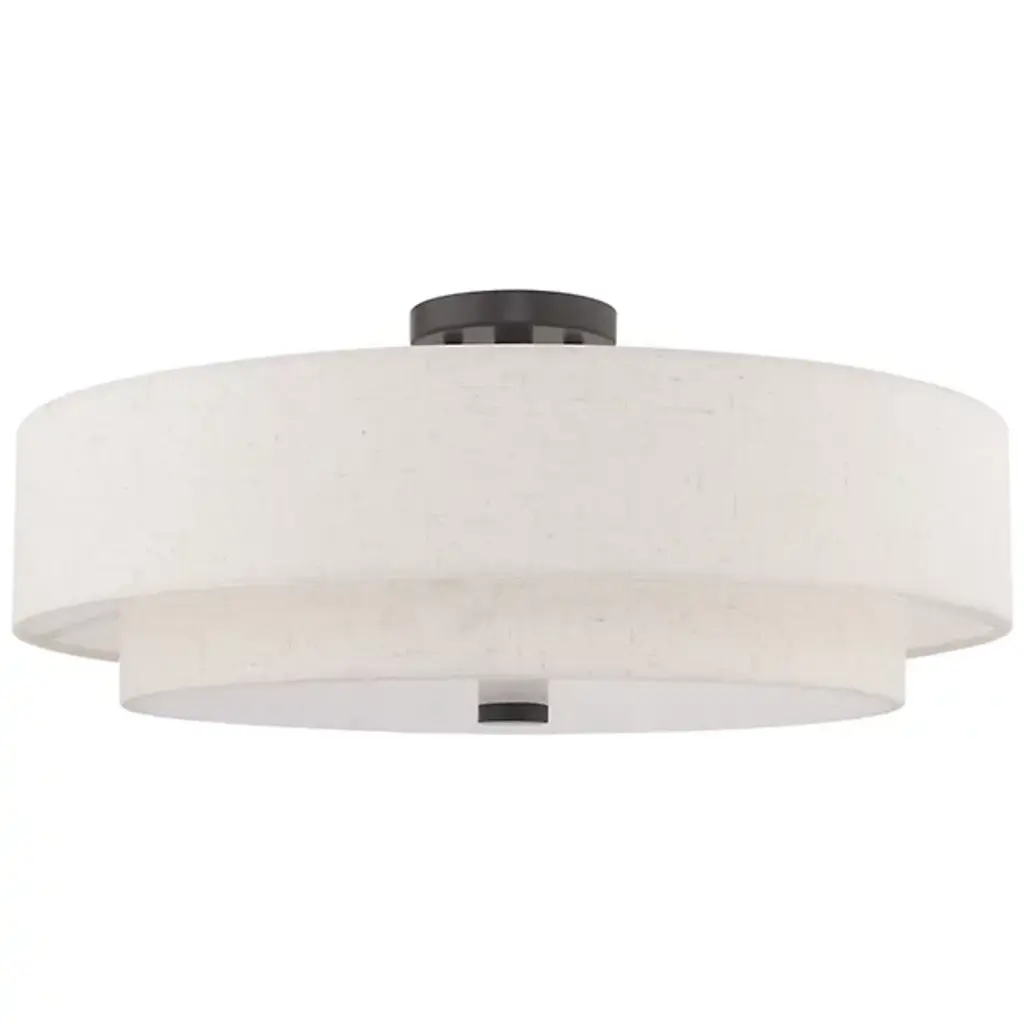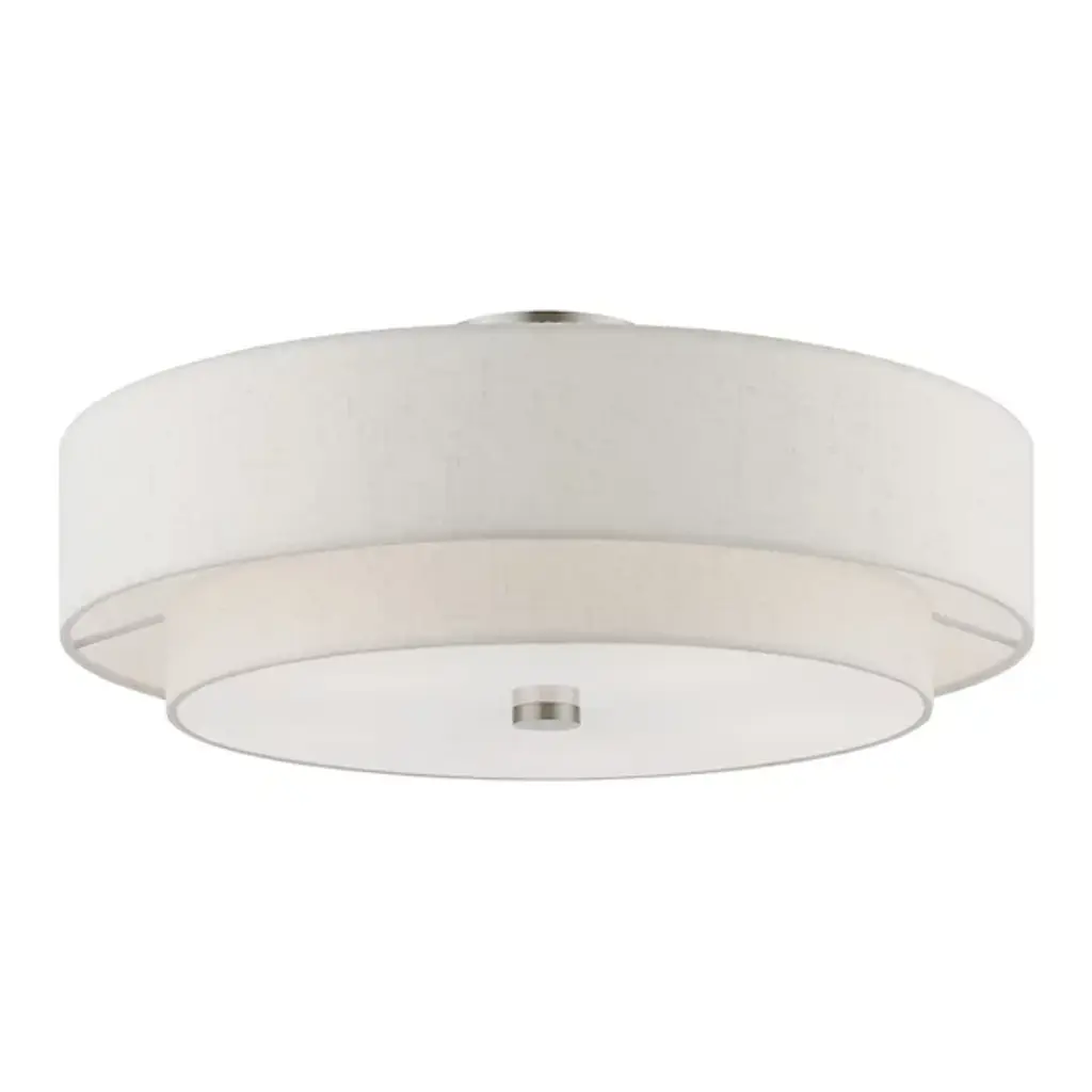 A concentric design with mesmerizing results. The Maureen Double Shade Semi Flushmount from Alder & Ore adds a stately transitional character to the home in its pairing of handcrafted shades. The piece sits close to the ceiling for an enhanced architectural look. Its steel mounting hardware delivers a sophisticated accent through a sleek finish. Both handmade, hardback fabric shades reach out in generous deep-dish forms. Together with a diffuser plate at the bottom, the dual shades present light with a soft, glare-free quality. The scale of the piece translates to a generous, atmospheric glow.