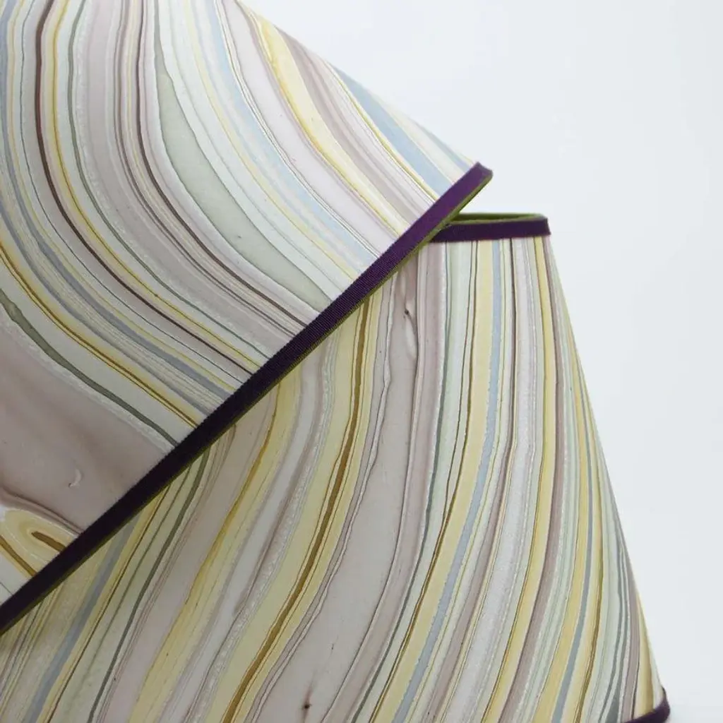 Marbled paper in a sophisticated stration of mauve, gold and stone; trimmed in two colors of grosgrain. Available in 3 sizes: 8” x 12” x 8.75” 9” x 16” x 11” 12” x 18” x 12” Pictured in 12″ x 18″ 12″ Please note that larged sizes use multiple sheets of paper. There are extra seems in the back of the shades. All shades are made to order, by hand and are not returnable Please be sure to double check sizing before ordering. Shades sold individually.