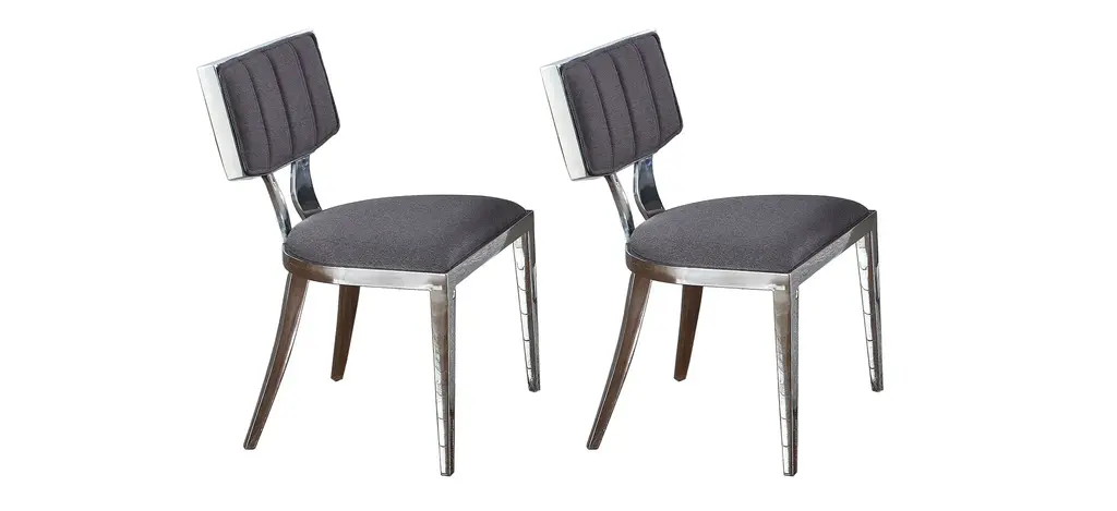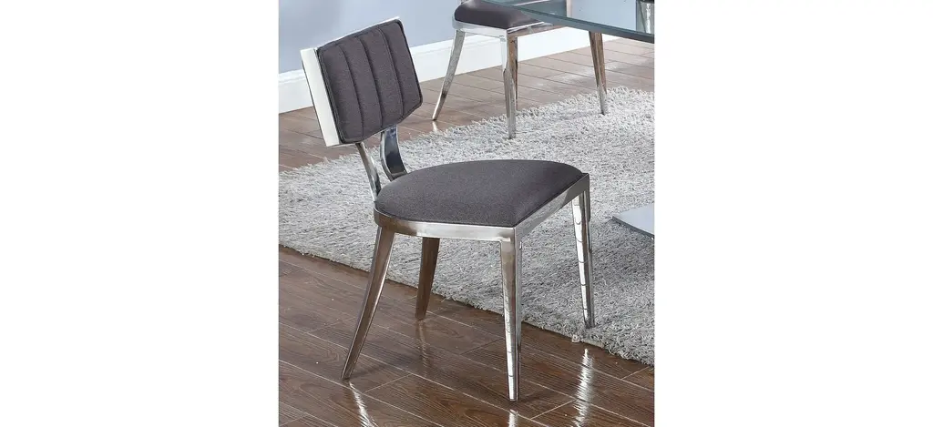 A retro-inspired Mavis dining chair set of 2 that combines the comfort of soft and durable gray polyester fabric upholstery with a solid and attractive polished stainless steel.