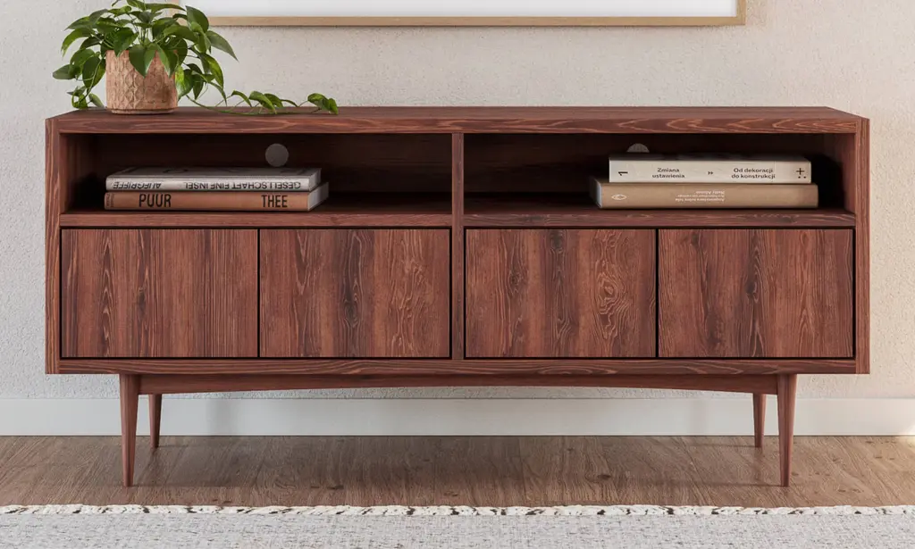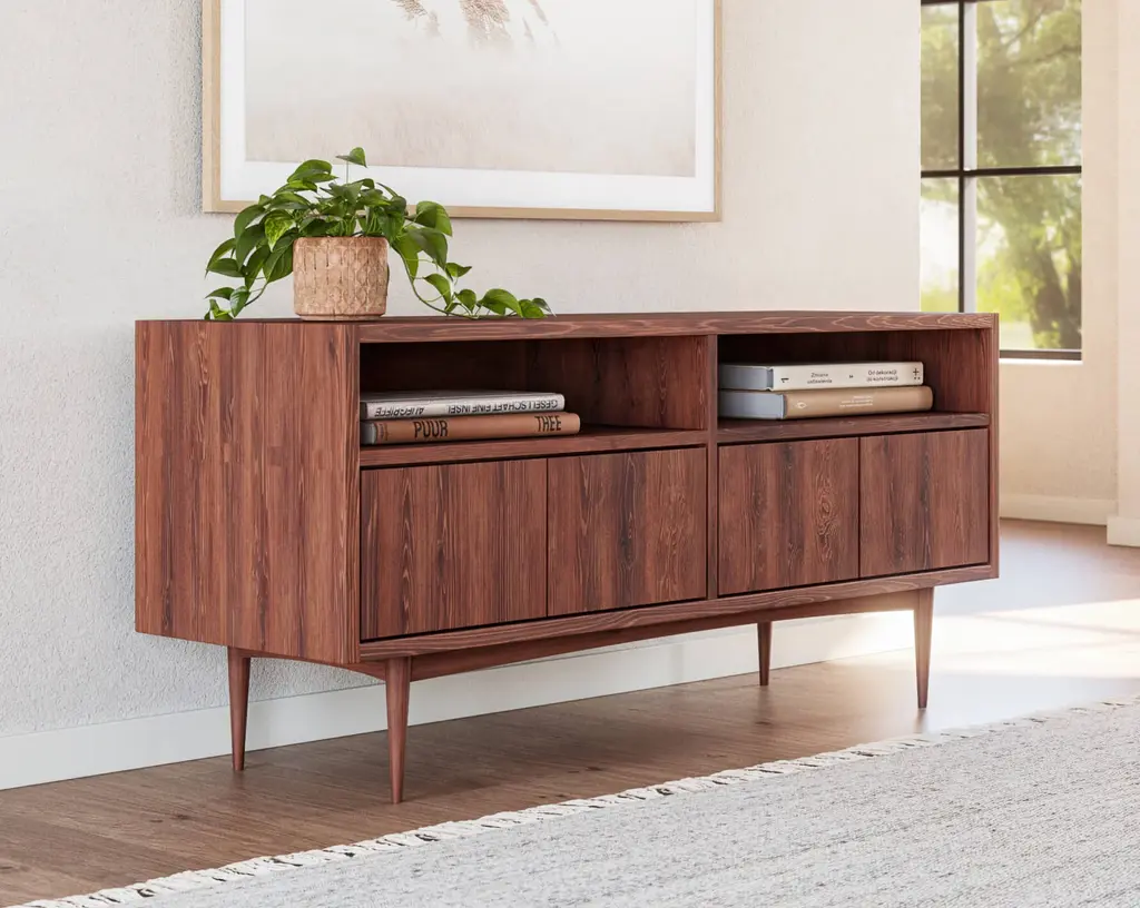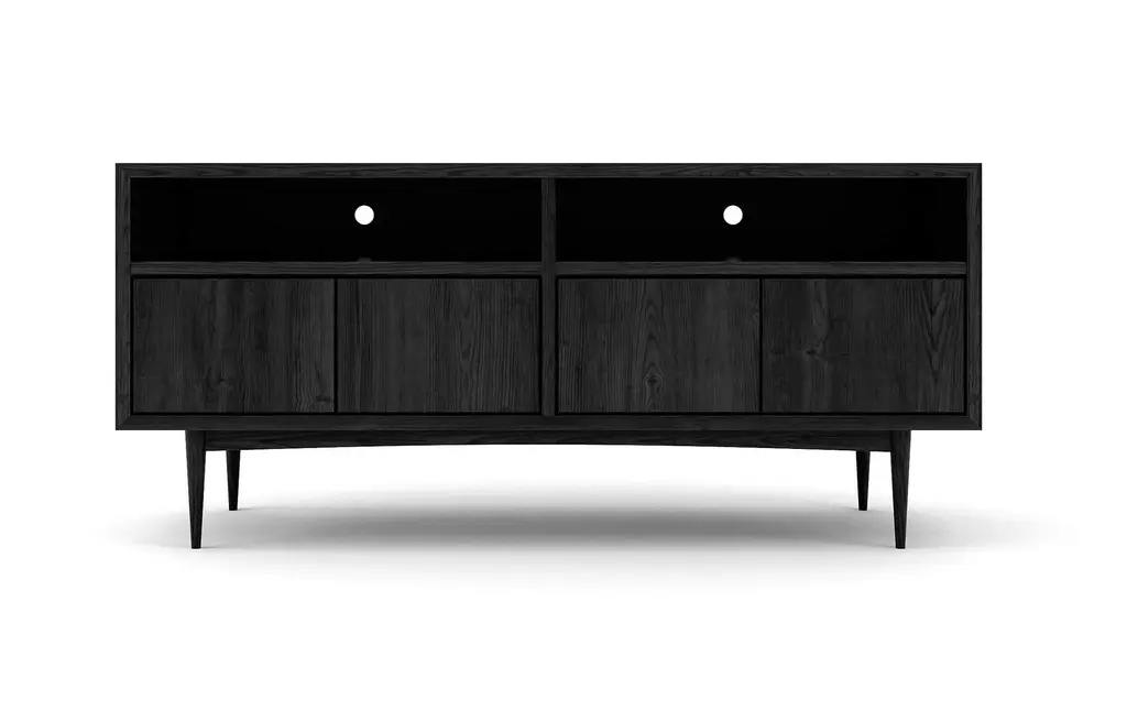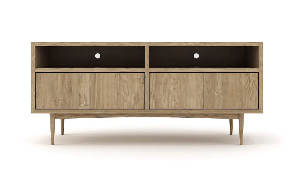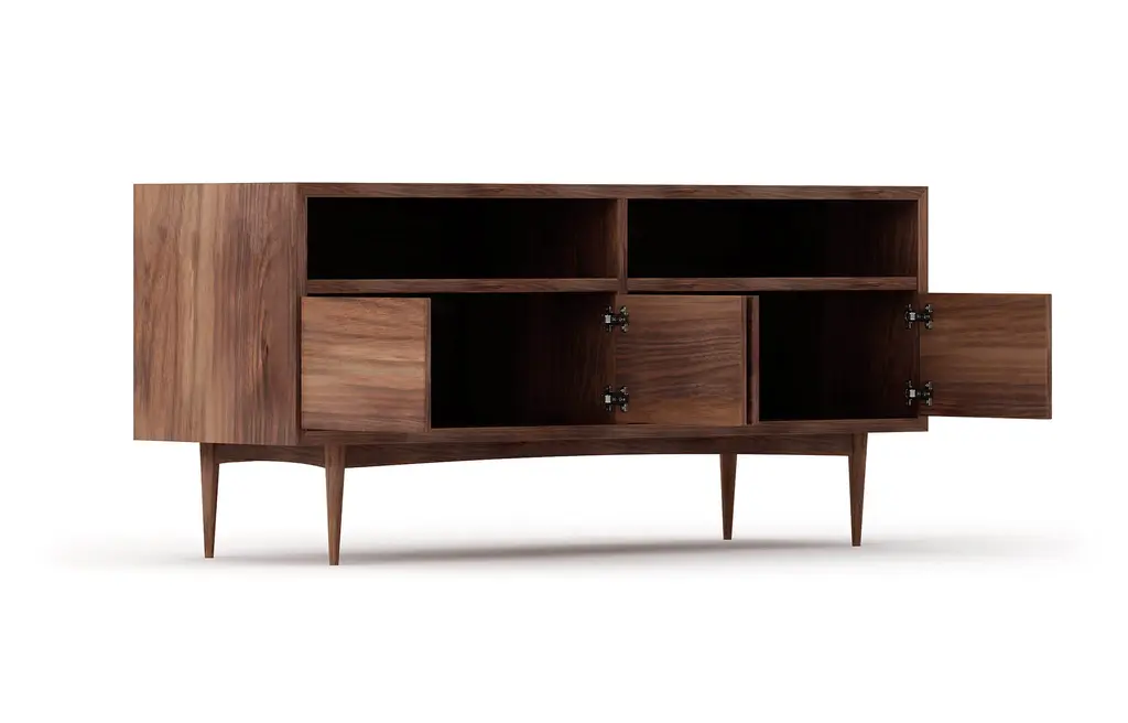 Sleek-ify your living room with Max Media Center's mid-century styling, graceful arched base, and classic joinery. Interior shelves and rear cutouts for media cord management keep everything neat and tidy.Top and sides crafted in your choice of beautiful, 100% solid hard White Maple or American Walnut. For additional strength and lightness, FSC-certified, low-VOC CARB 2 compliant Maple or Walnut engineered hardwood is used elsewhere.
