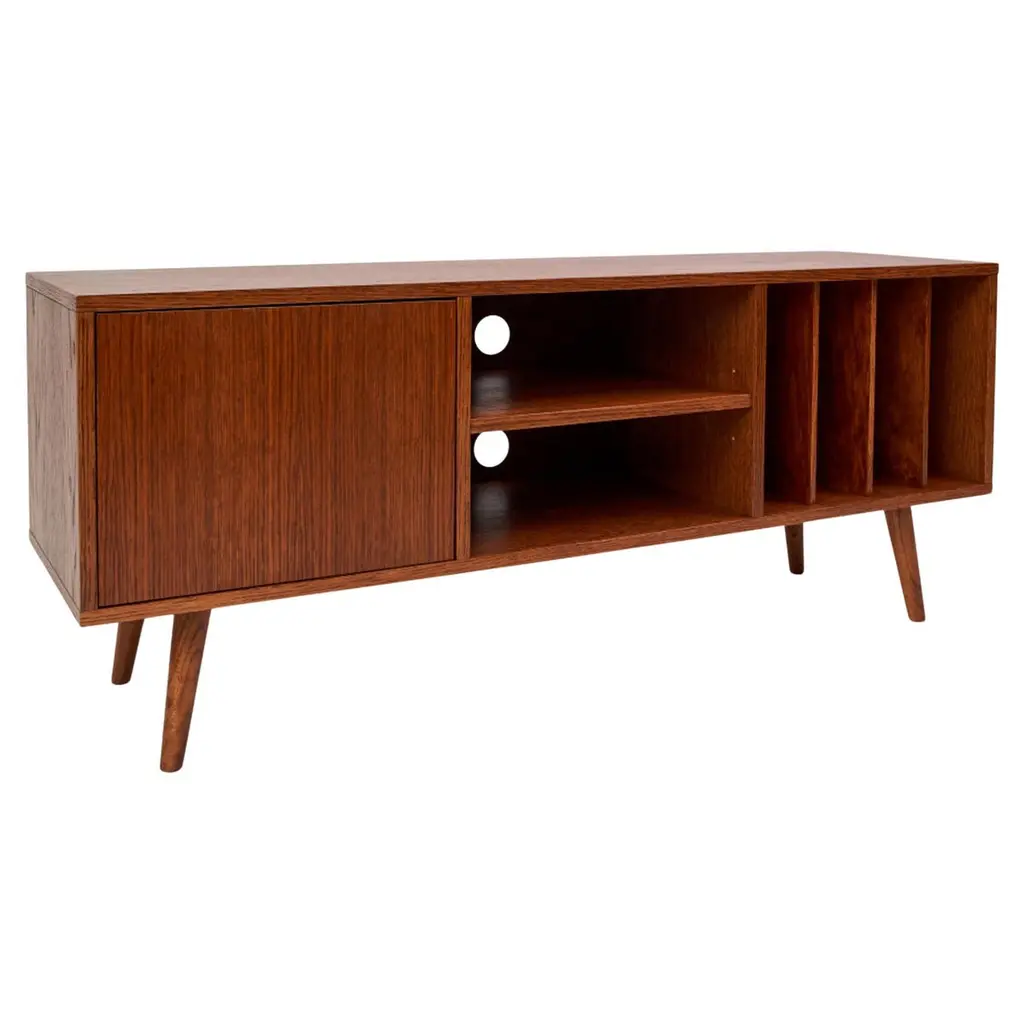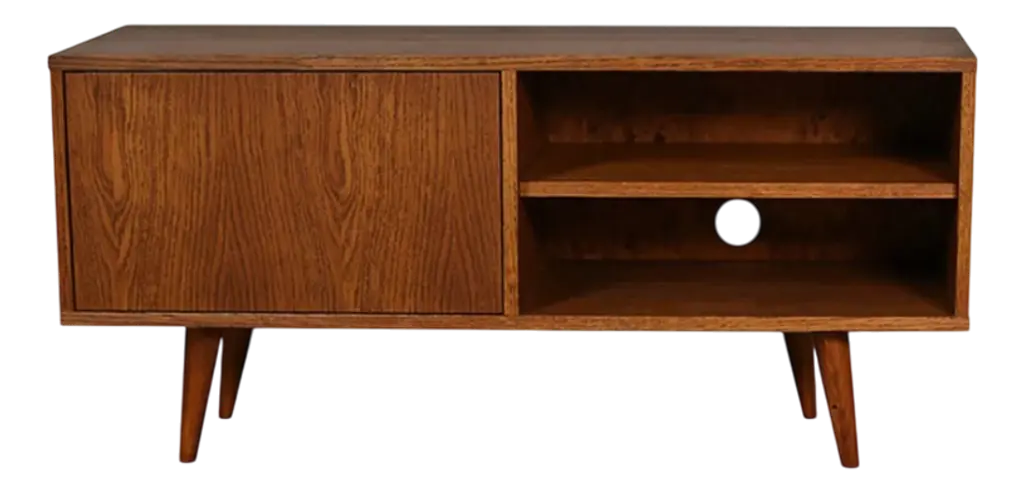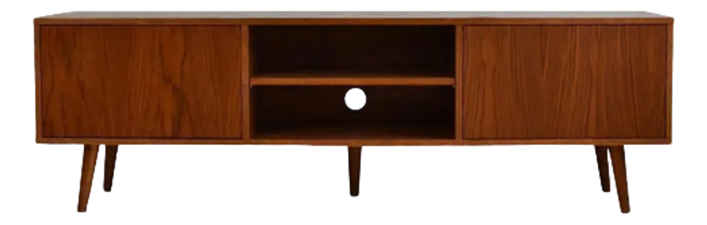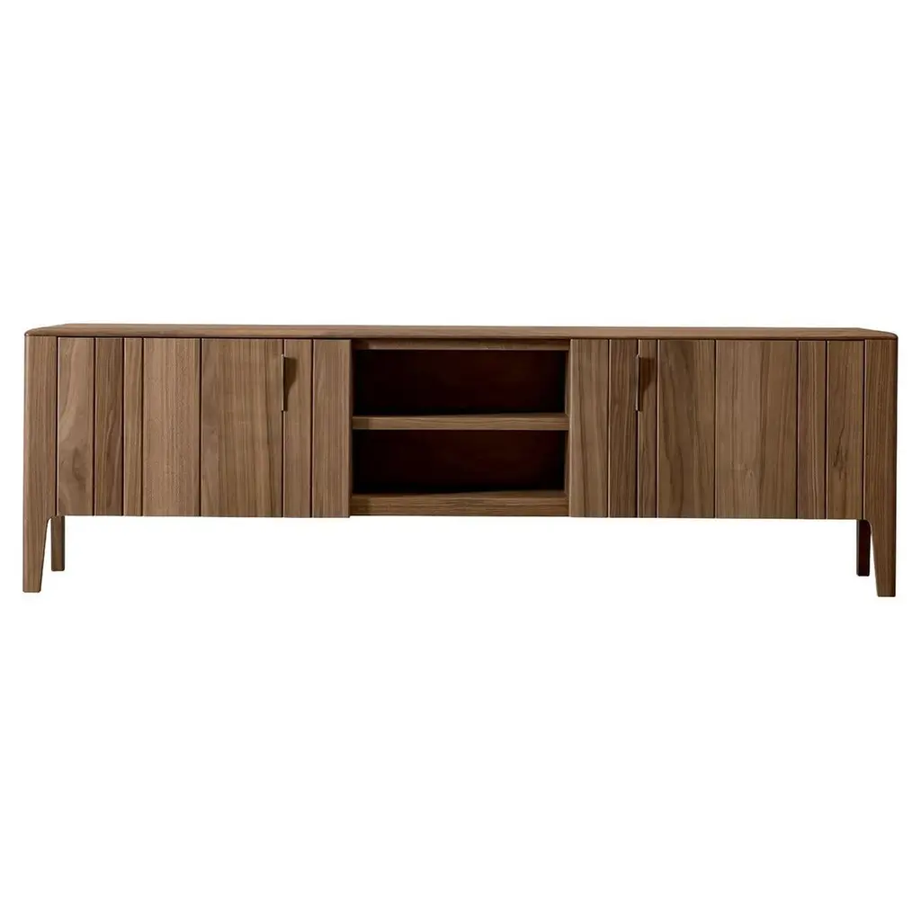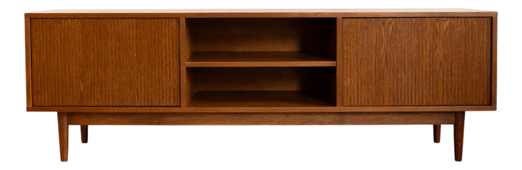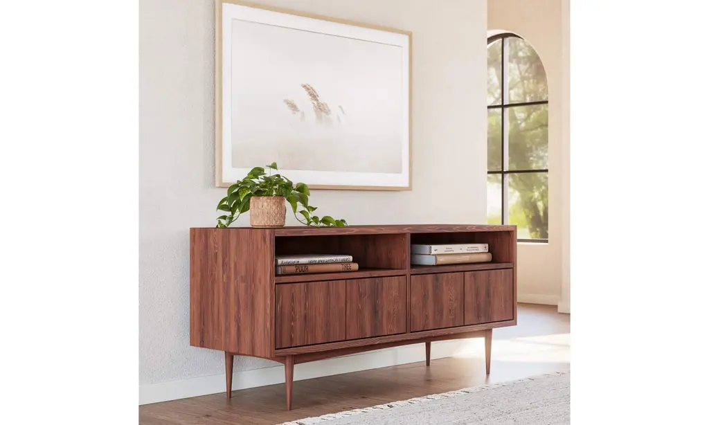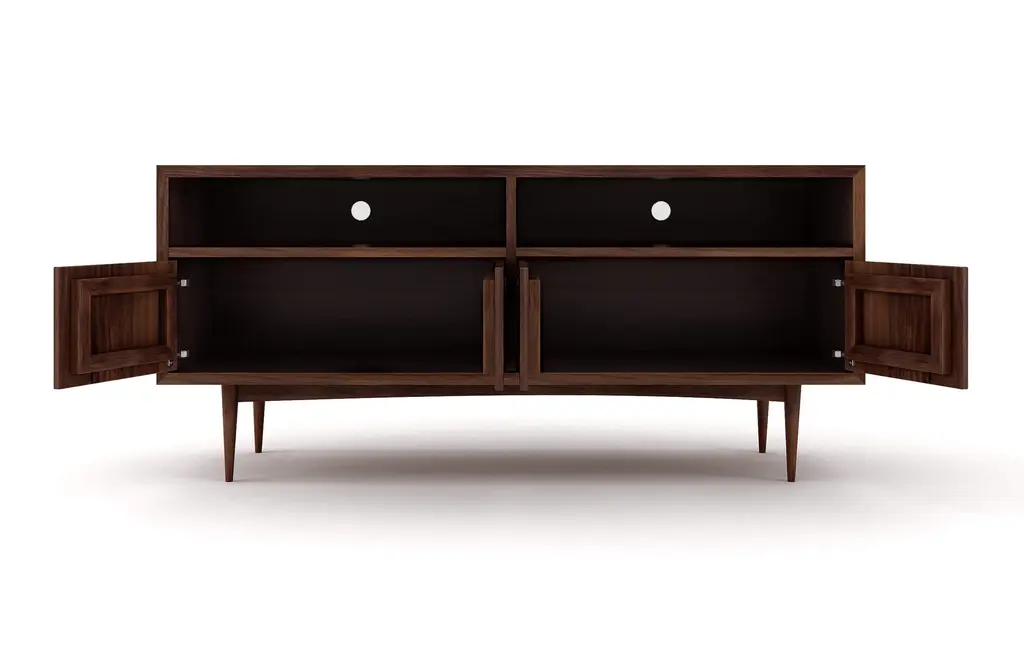 Sleek-ify your living room with Max Media Center's mid-century styling, graceful arched base, and classic joinery. Interior shelves and rear cutouts for media cord management keep everything neat and tidy.Top and sides crafted in your choice of beautiful, 100% solid hard White Maple or American Walnut. For additional strength and lightness, FSC-certified, low-VOC CARB 2 compliant Maple or Walnut engineered hardwood is used elsewhere.