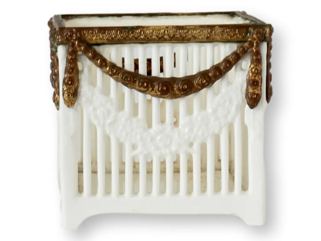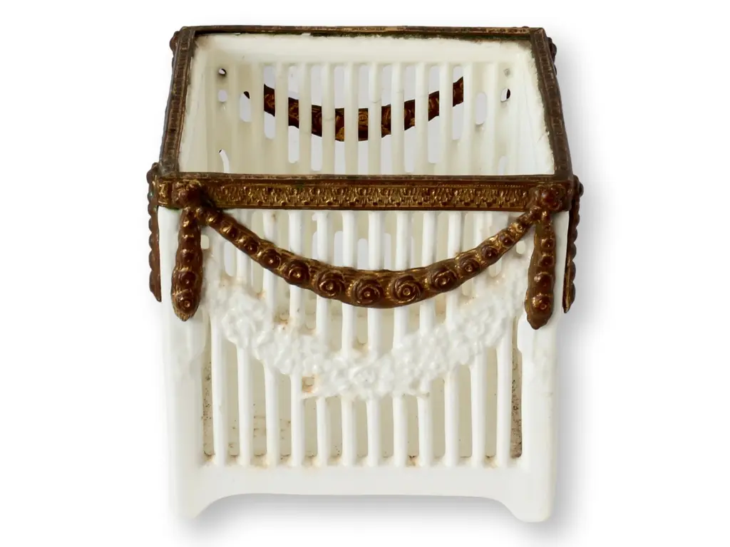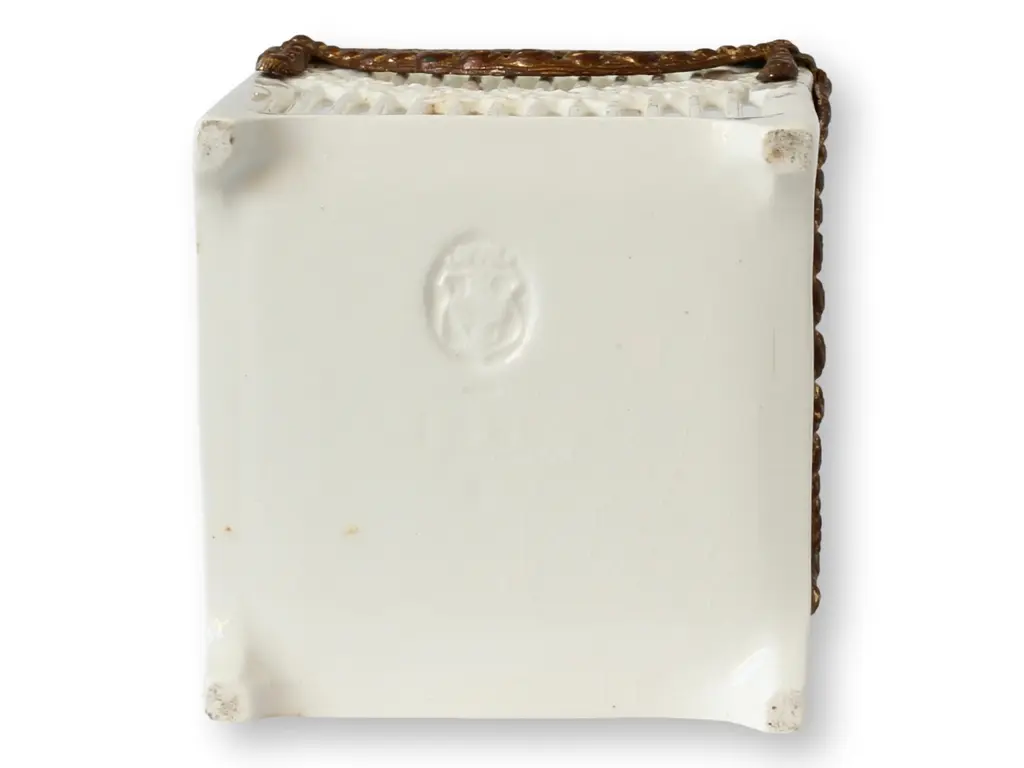 Charming Max Roesler creamware basket cache pot, featuring delicate brass embellishments that add a touch of elegance to its classic design. This small yet exquisite piece is marked with the RVR Rodach impressed marks, a testament to its authenticity and quality. Perfect for adding a refined accent to any space, this cache pot showcases the timeless craftsmanship of Max Roesler and is a beautiful addition to any collection of fine ceramics.