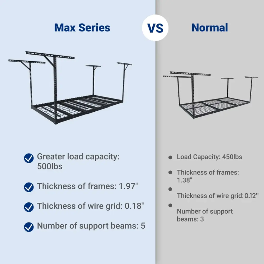 Engineered for Maximum Strength – The FLEXIMOUNTS Max Series Built with a reinforced steel frame, the FLEXIMOUNTS Max Series delivers rock-solid performance to handle all your garage storage demands. Compared to the Original Series, the frame thickness has been upgraded from 1.38 inches to 1.97 inches, providing increased durability and load-bearing capacity. The wire platform is securely supported along the rack’s perimeter, with additional internal braces added to enhance stability. To further boost strength, the wire thickness has been increased from 0.12 inches to 0.18 inches, making it capable of supporting your heaviest items with confidence. When only the highest quality and strength will do, the FLEXIMOUNTS Max Series stands out as the ultimate choice for premium garage storage solutions.