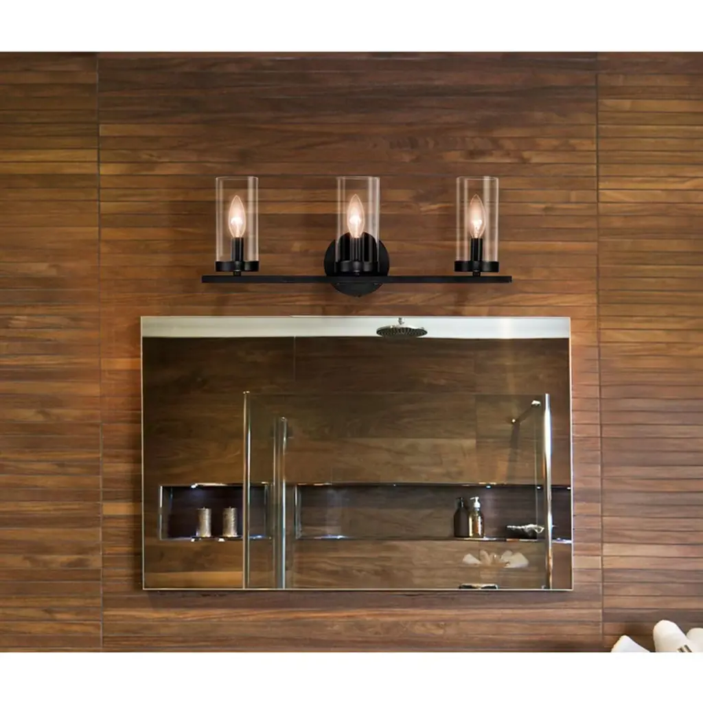 This collection of forever classic designs are available in both Satin Nickle and Black finishes with Clear glass. These fixtures were designed to install easily and priced to work in packages. Mounting Direction: Up Back Plate Height: 4.75 Back Plate Width: 4.75 Dimmable: Yes Shade Included: Yes Shade Dimensions: 6.50 Material: Glass, Finish Color: Black, Height: 8", Length: 21.25", Depth: 6", Height From Outlet Box: 6", Backplate Width: 4.75", Backplate Length: 4.75", Lamping Type: Incandescent, Number Of Bulbs: 3, Wattage: 60 Watts, Dimmable: Yes, Moisture Rating: Damp Rated