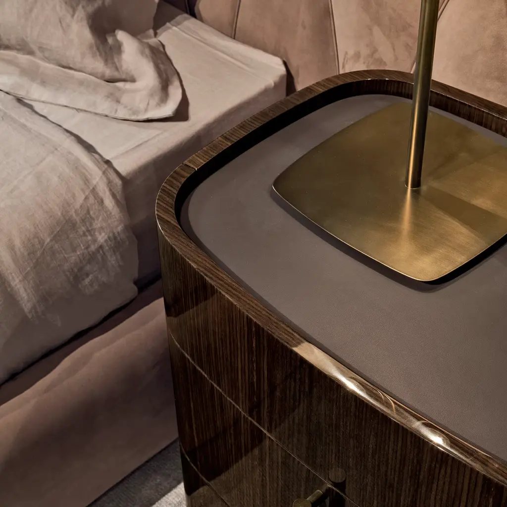 Crafted from curved plywood in a brushed gloss dark walnut veneer, the Mayfair 3-Drawer Side Table brings a chic elegance to your contemporary style bedroom. The side table features lined drawers on soft metal runners, brass base and handles in a burnished brass finish and a top in marble or leather. Shown here with top in dark clayton leather (CAT A).