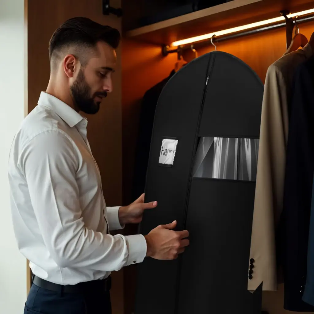 Lightweight Yet Durable for Everyday Use Crafted from nonwoven fabric, Mber’s garment bags are light enough for daily use yet durable enough to handle long-term storage. Their breathable design protects clothes from dust and moisture, making them ideal for jackets, coats, and seasonal wardrobe rotation. Convenient Fold-and-Carry with Metal Hanger Hole Thanks to the built-in metal hanger hole, each garment bag can be folded neatly over a hanger and carried with ease. Whether you're transporting a winter coat or your favorite blazer, this feature adds portability without sacrificing protection. Instant Identification with Clear Window & Tag Slot Each bag includes a large see-through window for quick visual checks and an oversized ID slot for name tags or notes. Whether you are organizing a closet or packing for an event, you will always know what is inside without opening the bag. Great Fit and Great Value - Comes in a 5 Pack With generous dimensions of 120x60cm, these bags fit a range of sizes from kids’ jackets to adult coats. And since they come in a practical 5-pack, you can organize multiple outfits at once. Perfect for families, performers, or travel wardrobes. Limited Lifetime Warranty Mber is a brand of Fosmon, Inc. Fosmon has served millions of customers for more than 10 years and every product comes with a limited lifetime warranty. If you are not completely satisfied with your purchase, reach out to our experienced and dedicated USA based customer service for support 24 hours a day, 7 days a week. Please refer to Fosmon’s website for more information. Specifications Dimensions: 120x60cm (47.24 x 23.62 inches)Material: NonwovenID Card SlotMetal Hanger HoleSturdy ZipperLarge Clear Window Package Includes 5x Suit Hanging Garment Bag