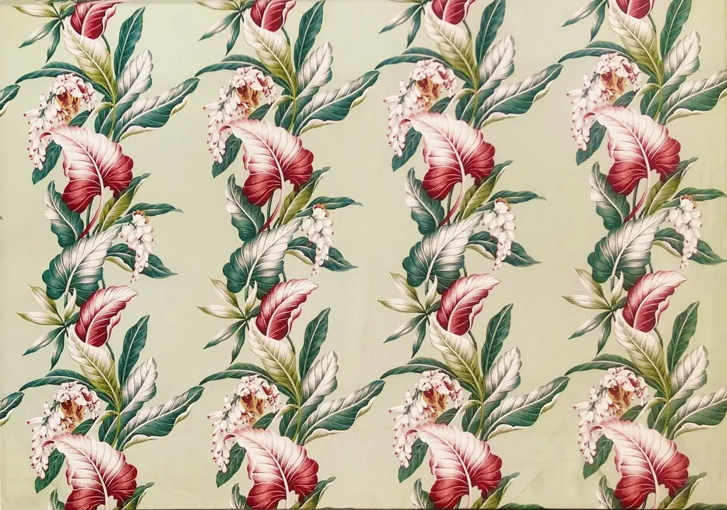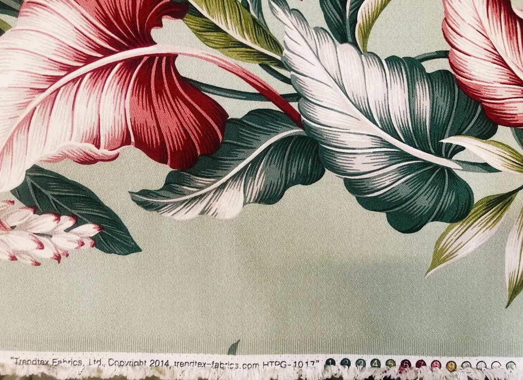 Mid-century style cotton woven broadcloth fabric with tropical floral print. This fabric is mint green featuring a beautiful pink, ruby, and emerald flower design and tropical leaf pattern by Trendtex Fabrics #HTPG-1017,This fabric could be used to make clothing and upholstery products.This fabric is sold by the yard and we currently have 25 yards available at 57.5 inches wide. Select the number of yards you would like from the quantity menuUnited States, 2014
