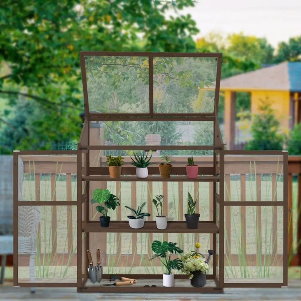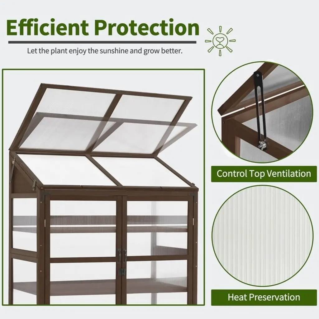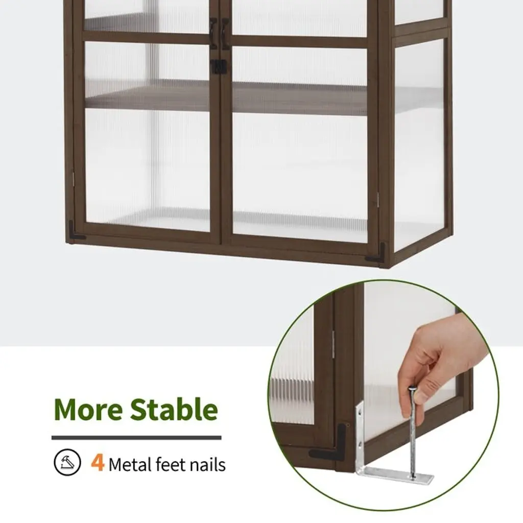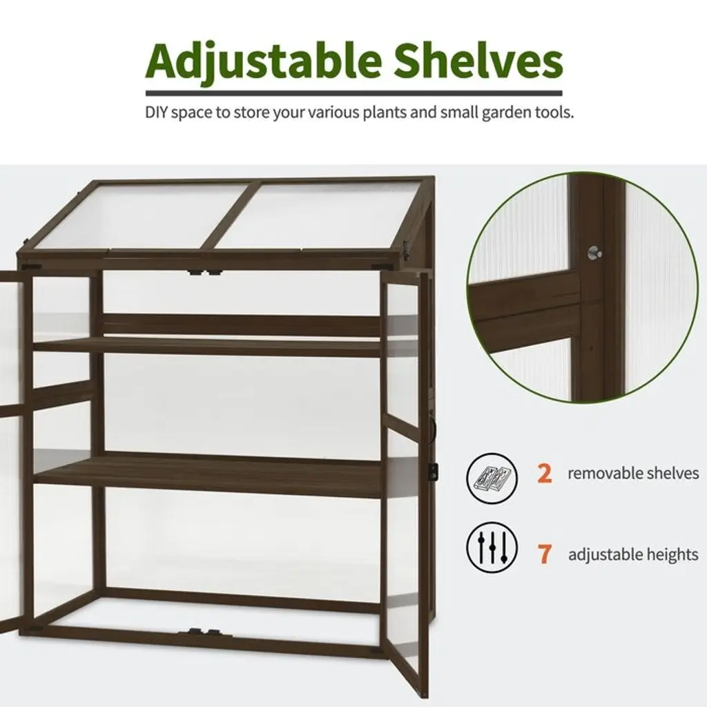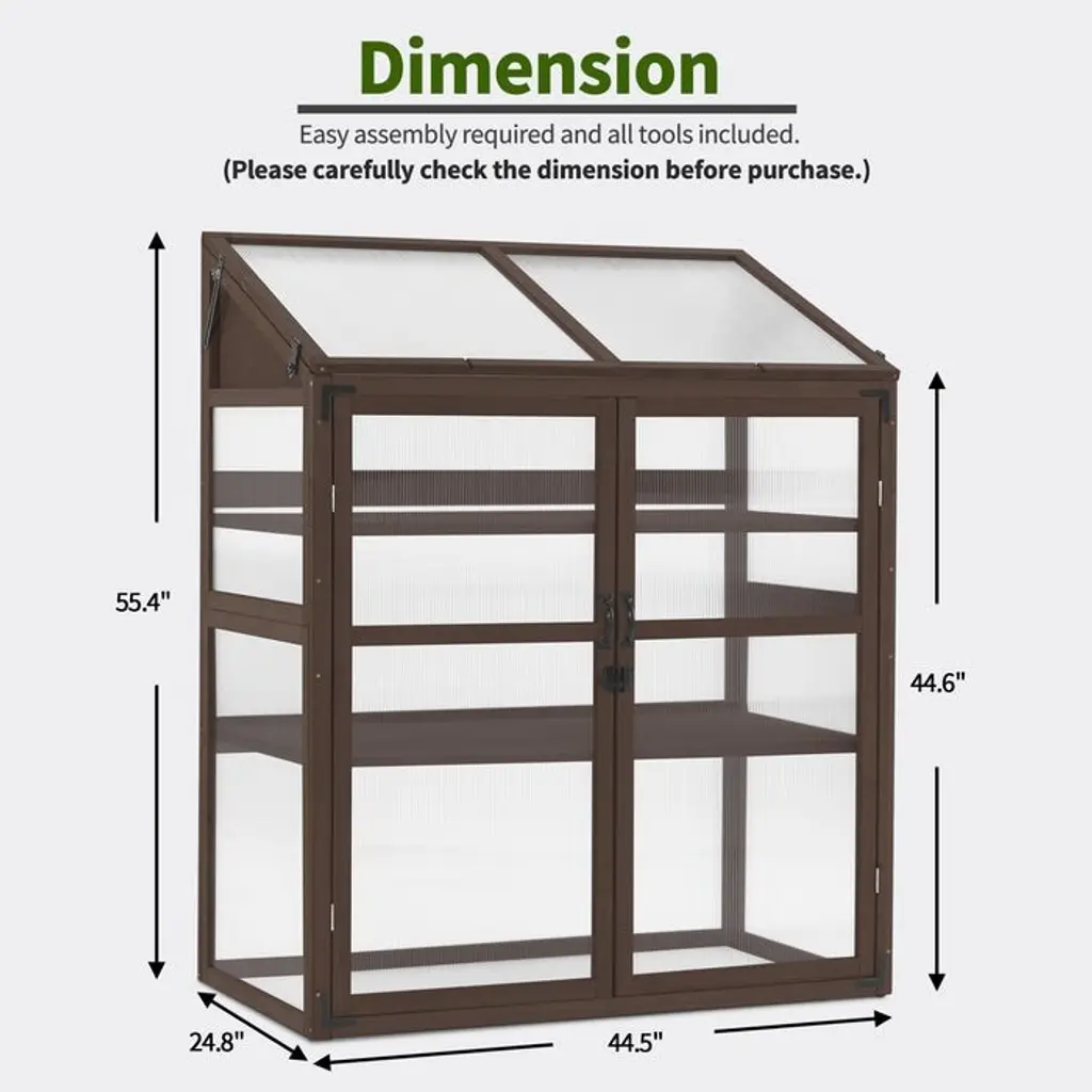 Make natural life accessible! About the ItemLarge Cold Frame: This greenhouse has a large size to provide enough space to organize your plants and small planting tools. (Overall Dimension: 44.5" x 24.8" x 55.4")2 Adjustable Shelf: The shelves of this garden cold frame could be freely adjusted height to fit various types of plants, which meets all your needs.Openable Roof: The bolts on the greenhouse frame kit sides could be used to fix the roofs and keep them open to provide a healthy ventilation system for your plants in different weather.Stable Device: The garden greenhouse is equipped with 4 reinforced metal brackets for enhanced stability and safety.Fir Wood: The wooden greenhouse is made of high-quality pure fir wood, and the exterior has been polished to express a rustic style. Medium brown blends easily with other décor and natural settings.PackagePackage Quantity: 1Reinforced Package System and Package Quality prevent Transportation Damage and Missing Parts100% Recyclable Environmental Protection MaterialsInstallation NotesExtremely Easy Assembly within 20-30 minutes2-Person Assembly RecommendedWarranty1-year Manufacturer Warranty.Within the warranty period, the replacement for any defective part will be supplied free of charge.We provide excellent after-sales service for this item, please rest assured to purchase!