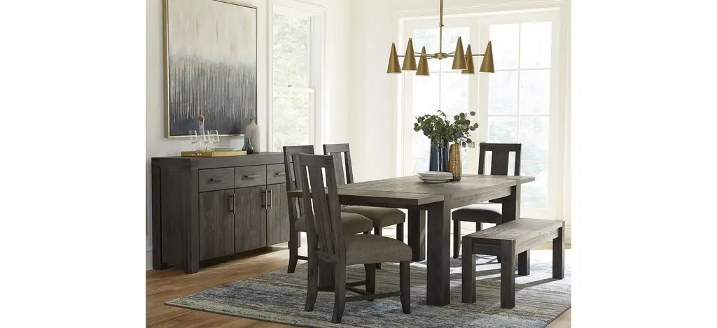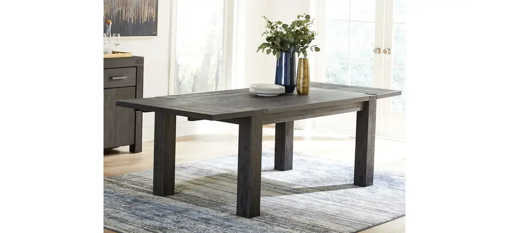 The Meadow Dining Table with leaf is rugged durability and contemporary styling defined. Crafted from solid acacia, its sleek lines showcase naturally occurring knot, grain and color variations inherent to the timber. Rustic wire brushing and a heavily glazed finish result in a perfect balance between modern and rustic.