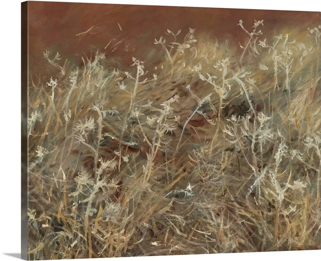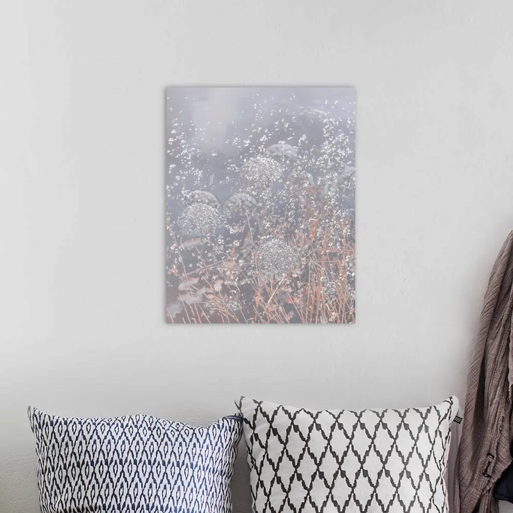 Dream-like photograph of flowers in a meadow with seeds blowing away in the wind.