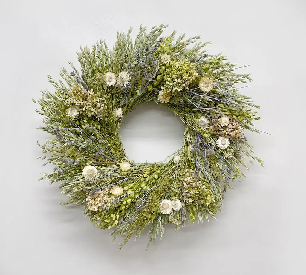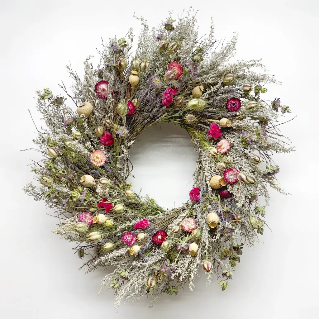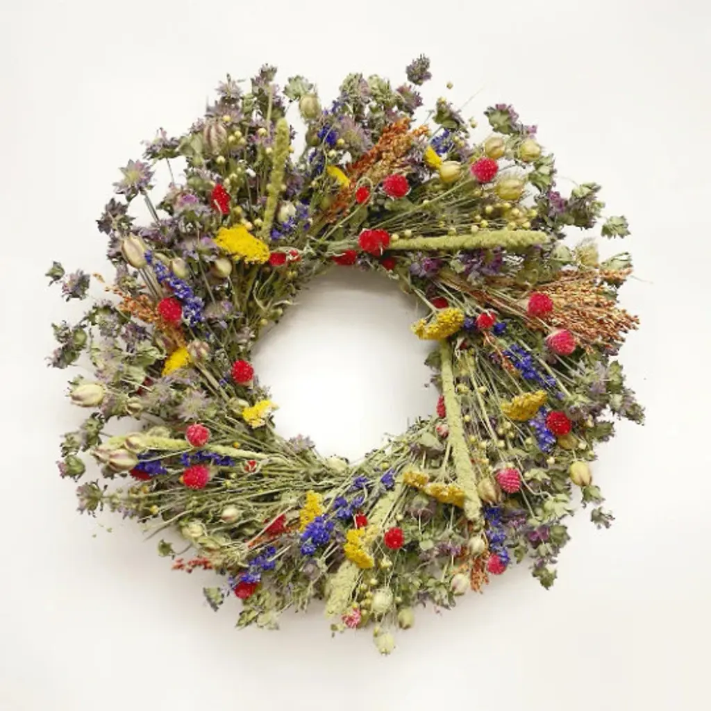 100% USA grown, air-dried and handmade, made to order wreath available in two sizes. This wreath is composed of a colorful parade of artemisia, lemon mint, larkspur, tansy, celosia, nigella, globe amaranth, safflower and strawflowers. This design can be hung outside in a protected location but will last much longer if kept indoors; sunlight will fade this wreath. Dried plants are a natural product; over time these once-living materials continue to lose moisture...changes in texture and color are normal and expected.