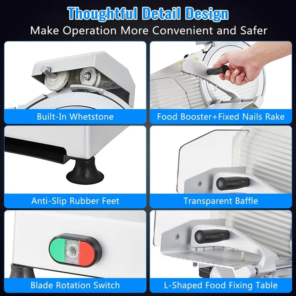 Our slicer machine is equipped with a hidden knife sharpener, which can safely sharpen the knife without removing the blade. The fixed transparent guard prevents accidental contact with the blade and ensures safety. Non-slip rubber feet ensure stability. The food pusher locks the meat securely and the handle is easy to operate.This electric food slicer can be used to cut meat, fruits and vegetables, delicatessen, bread, cheese and other foods. meat slicer machine for home or commercial use, such as kitchens, restaurants, butcher shops, canteens, etc.