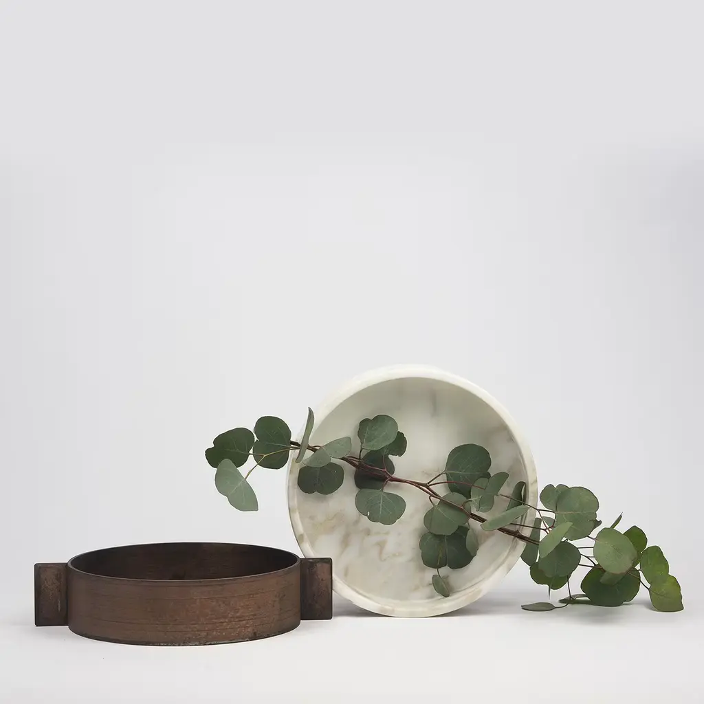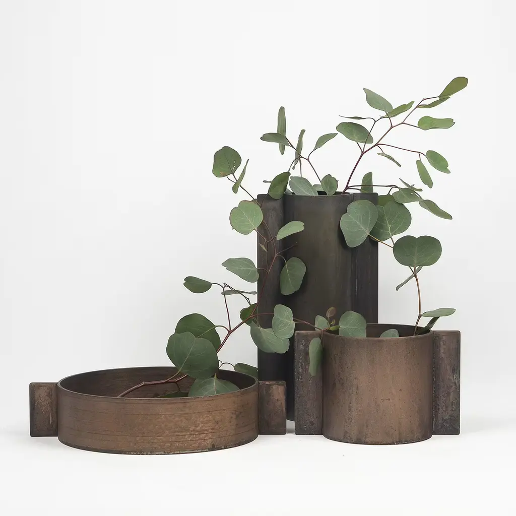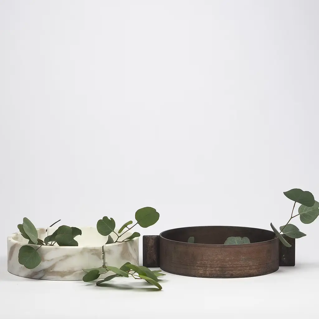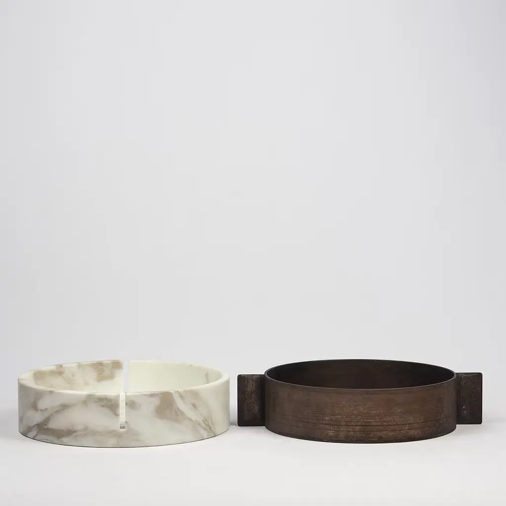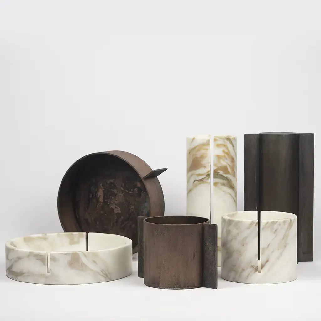 The mechanical act of opening and closing allows or denies access to a place, to contents to be protected, hidden or kept secret. This collection of containers composed of elements in Calacatta Oro marble and Jerissa stone and in natural metal and Corten interlocks elements that represent the boundary between inside and outside, closed and open, private and public.