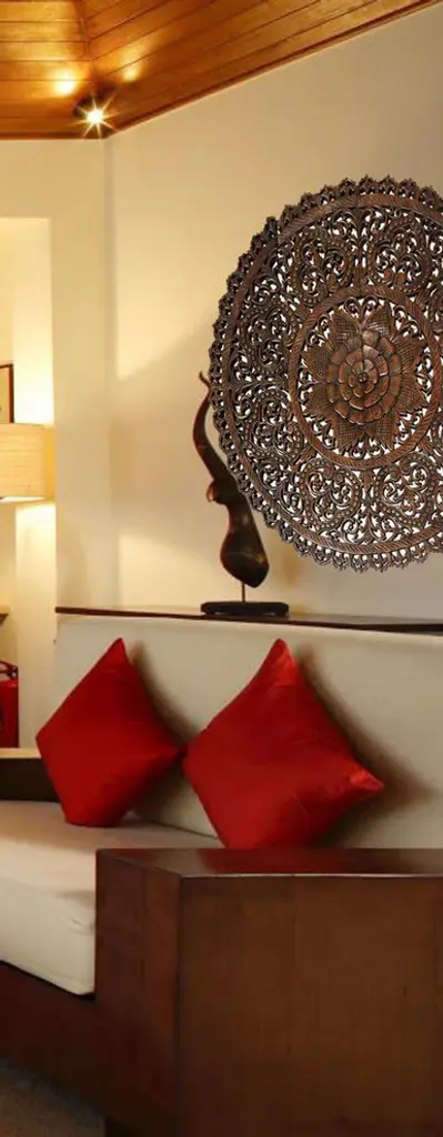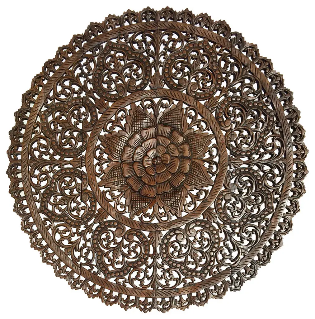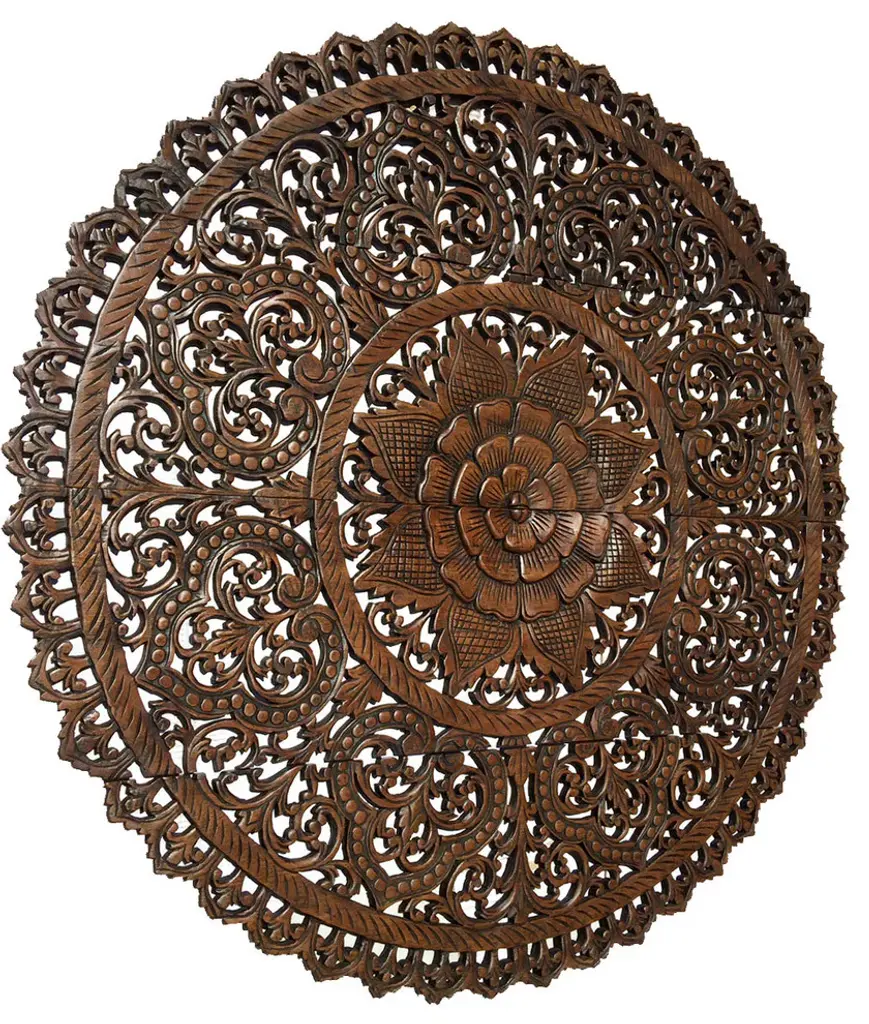 Round carved wood sacred fig leaf Wall décor with center lotus flower. Large decorative carved wood wall art plaque. Perfect for large wall decoration. Floral wall art that will add beauty to any room. Creating luxurious decorative designs from traditional to contemporary home. Bring warmth and character to any room in your home. Made from teak wood. A product of Thailand that expresses a wonderful home decorative ambiance.48"x48" - 4 panelsSIZE • WEIGHT • COLOR• MATERIAL (Each panel)Height: 48.0" InchesWidth: 12.0" InchesThickness: 0.5" InchesWeight: 5.0 lbs.Material: Teak WoodKeyhole mounting included