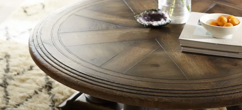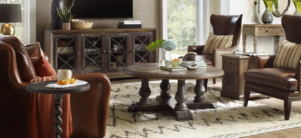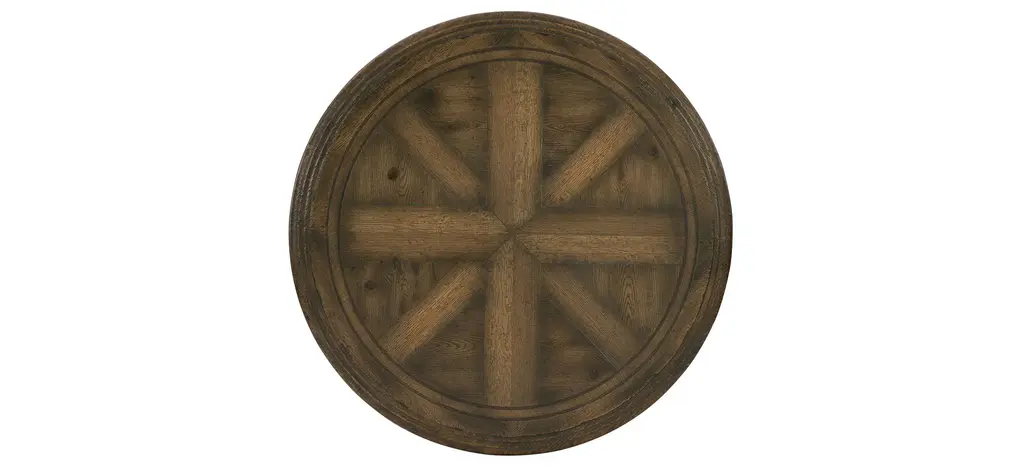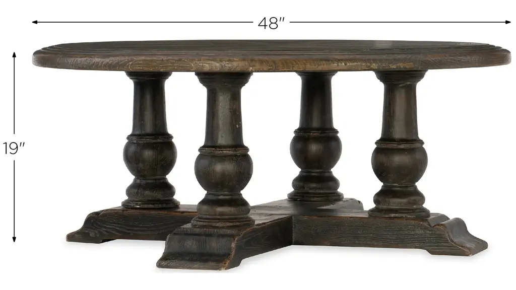 Imparting an authentic American character, the Medina Round Cocktail table is inspired by the Texas Hill Country and crafted of White Oak and Walnut Veneers. The chunky shaped base with bracket feet is covered in a timeworn saddle brown finish paired with an anthracite black with dusty-wax hand up to create a two-tone finish.