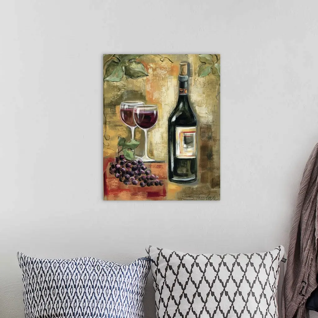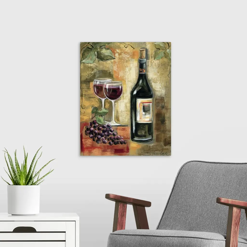 Large, vertical home art docor of a bottle of wine sitting next to two full glasses and a bunch of grapes in the foreground. Painted on a patchy, rough background surrounded by vines and leaves.