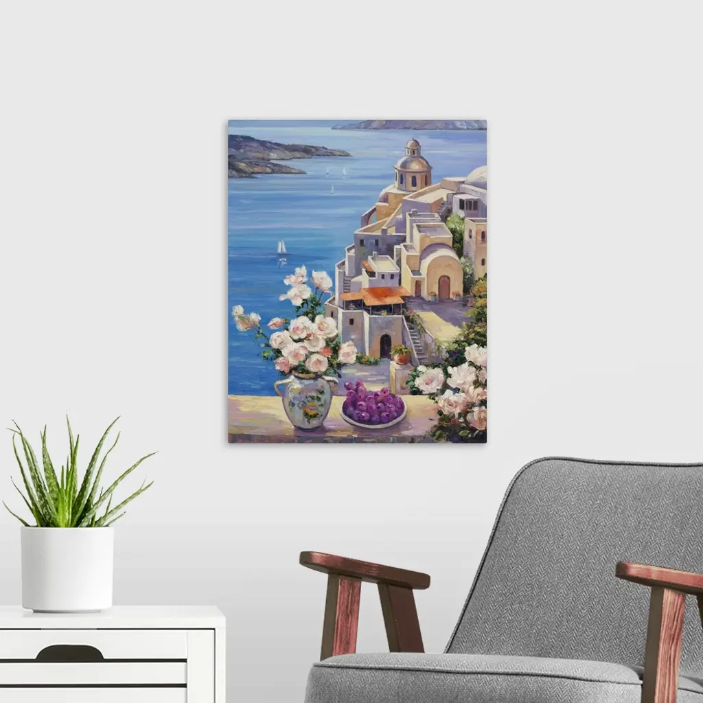 A seascape with a rose arrangement in the foreground.