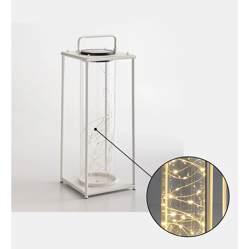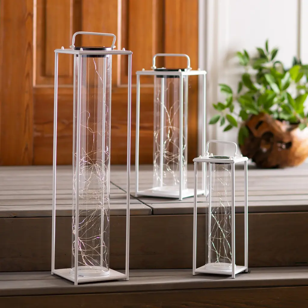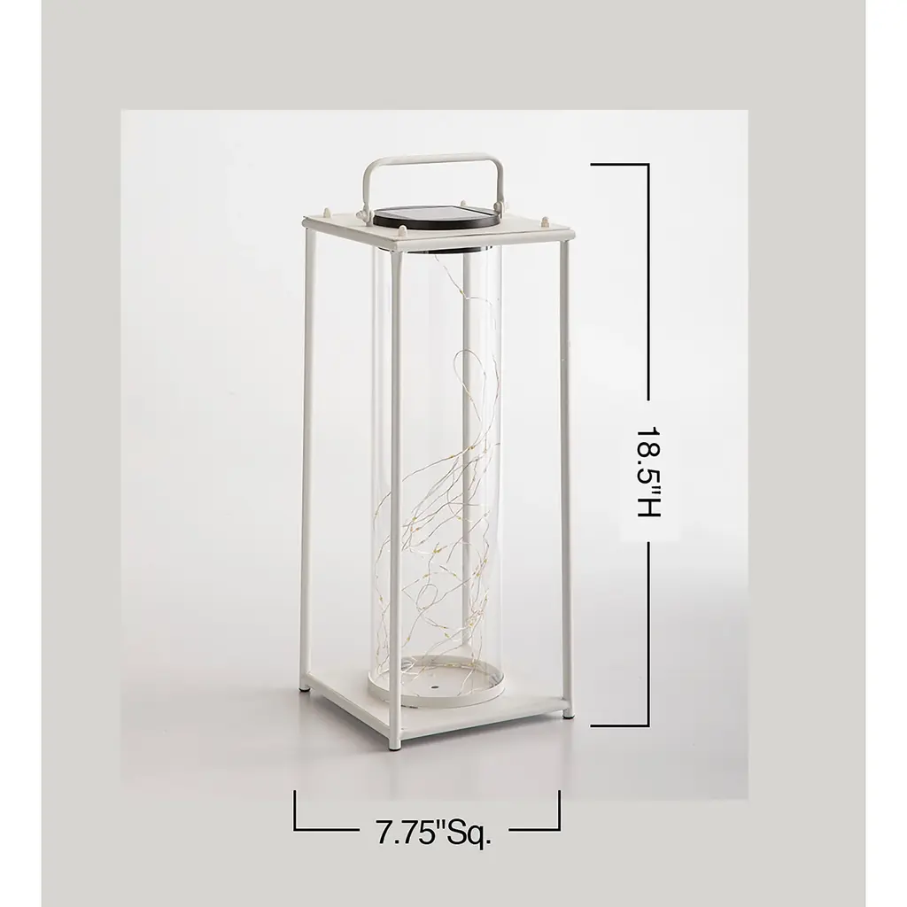 This modern Firefly Solar-Lighted Lantern creates a dazzling and luminous look for your deck, porch, or sunroom. Set it on a table, on the floor, patio, or hang it. LED micro-lights charge in the daylight and light up with a warm glow after dark. Made of corrosion-resistant iron and sturdy tempered glass, each piece will retain its masterfully handcrafted appearance for years. With its classic, sturdy body in a traditional black or white finish and its modern solar technology, the Firefly Solar-Lighted Lantern is a perfect, versatile outdoor accent. Perfect for home, weddings, churches, restaurants, and events. On/off switch, 6-hour light.