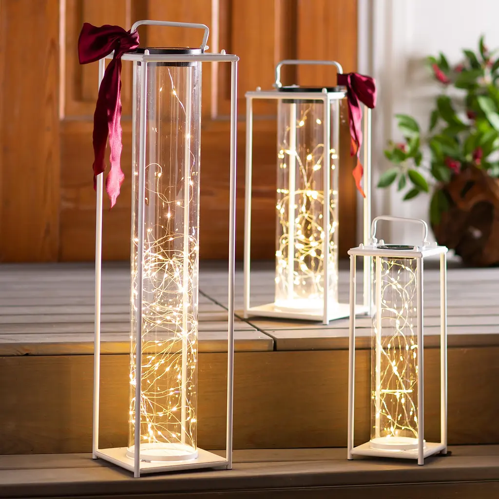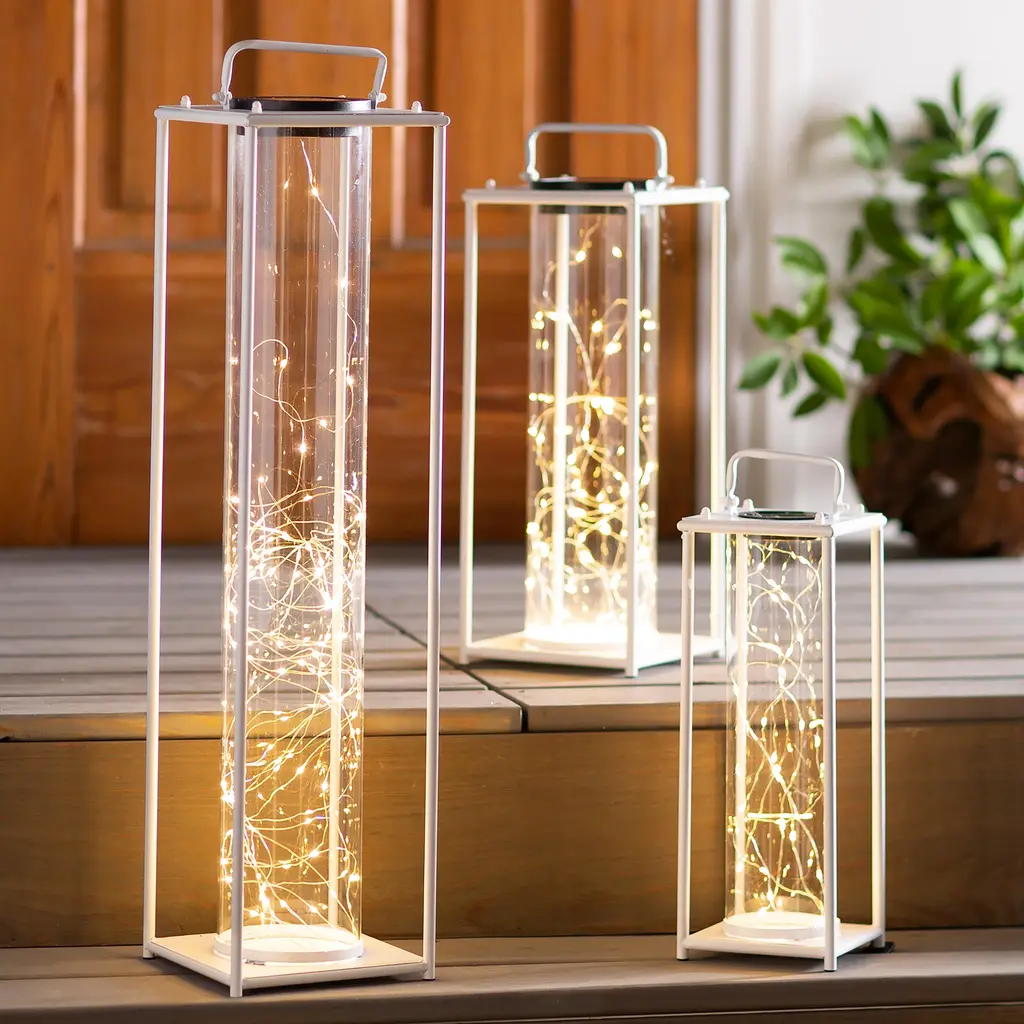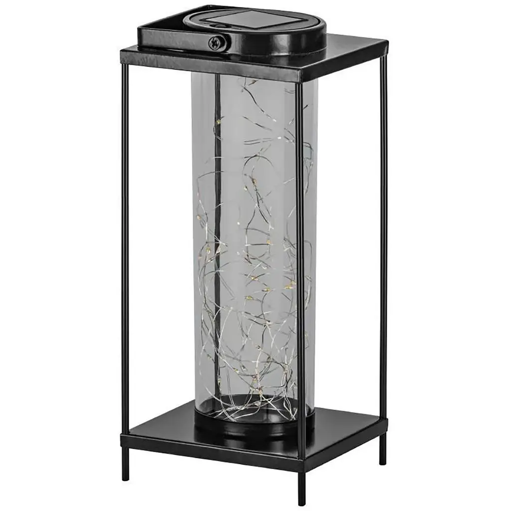 This modern Firefly Solar-Lighted Lantern creates a dazzling and luminous look for your deck, porch, or sunroom. Set it on a table, on the floor, patio, or hang it. LED micro-lights charge in the daylight and light up with a warm glow after dark. Made of corrosion-resistant iron and sturdy tempered glass, each piece will retain its masterfully handcrafted appearance for years. With its classic, sturdy body in a traditional black or white finish and its modern solar technology, the Firefly Solar-Lighted Lantern is a perfect, versatile outdoor accent. Perfect for home, weddings, churches, restaurants, and events. On/off switch, 6-hour light.