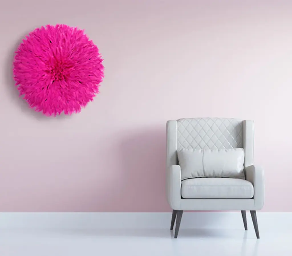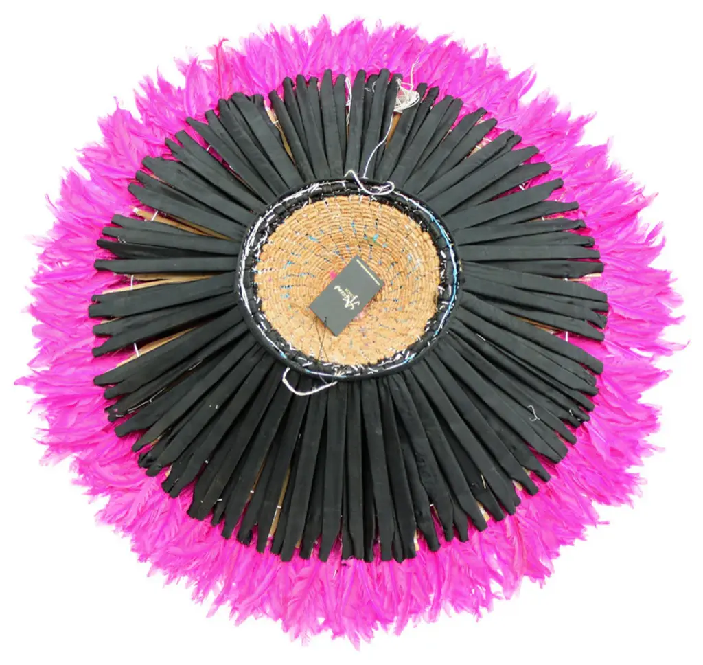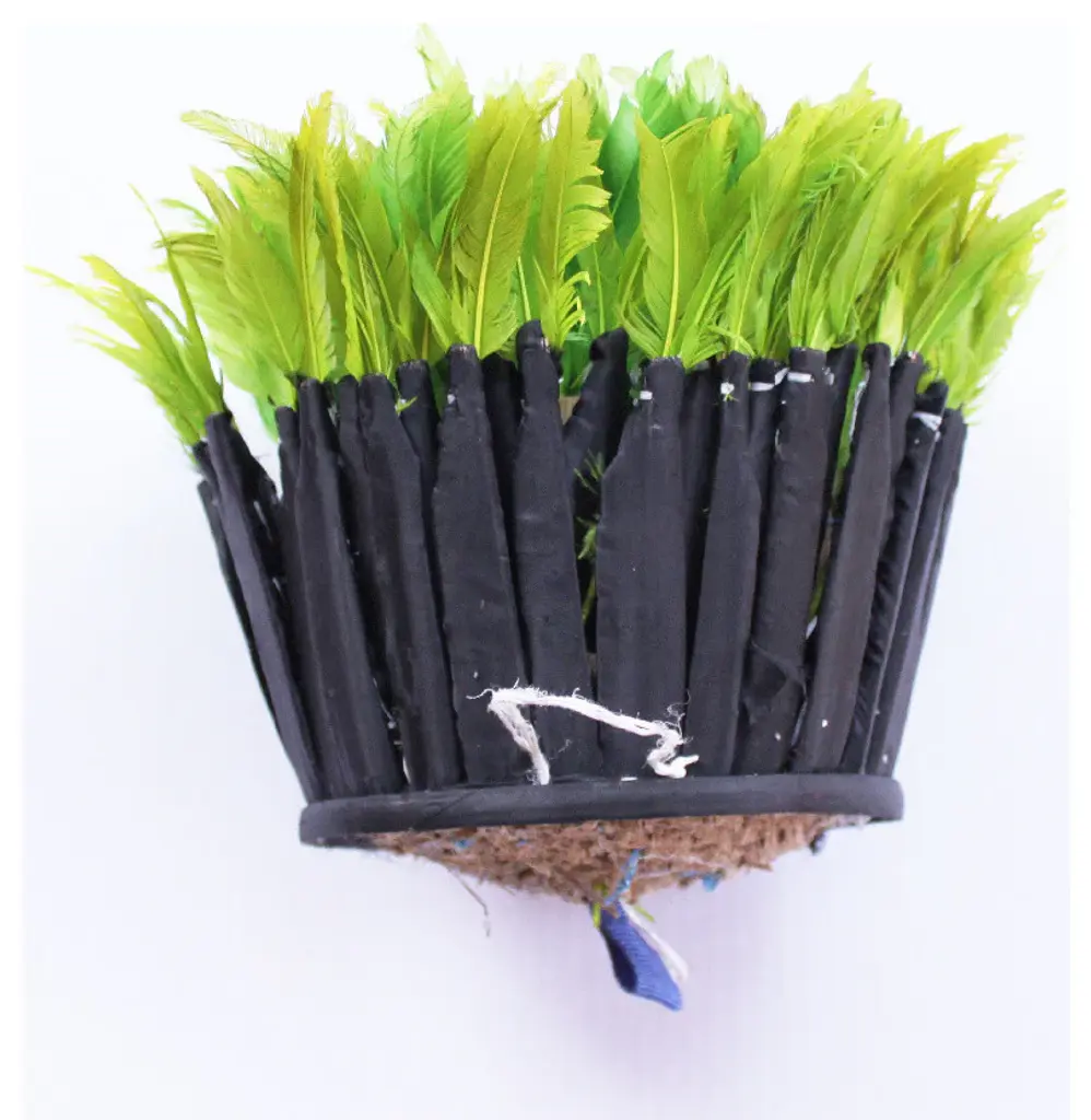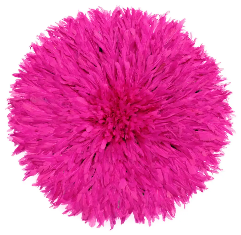 Origin: CameroonDimension: 26-28 inches diameter.Profile dimension from wall surface (when open and suspend): approx. 3 inches (8 cm).Color may differ slightly from photos due to different monitor settings. Also, the color may vary from one product to another due to the dye on feathers.Materials: Raffia wood, Hens feathers, fabric, plastic string, dyes for color.Imported. All Juju Hats have been fumigated before importation.Maintenance: Juju Hats need some love too. To maintain a beautiful Juju a little maintenance is necessary. Spray the feathers every 3 to 4 months with an anti-moth to prevent from any damages caused by insects. To remove the dust on the Juju, use a hair blow dryer on low temperature. Keep blow dryer at least 12 inches (or 30 cm) away from the feathers. If needed rearrange the feathers with your fingers.This artful Juju Hat, the Tyn Hat is handcrafted in Cameroon. For centuries, Bamil tribes have been making those hats that symbolize prosperity and freedom. Once, Juju Hats were worn by medicine men and royalties during tribal ceremonies. Nowadays, their customs are less restricted during Bamil traditional rituals and their beauty has reached homes beyond Cameroon, borders. Those headdresses are very impressive hung on walls. Juju hats are made from natural or dyed feathers and woven raffia. Artisans take 2 to 3 days to complete one hat.