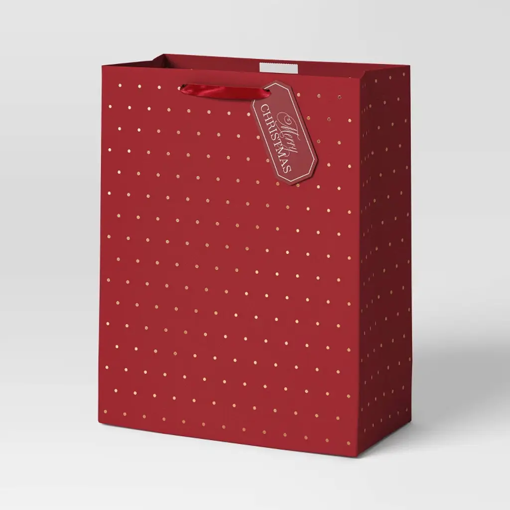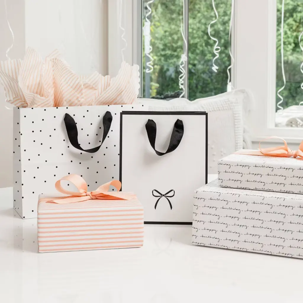 Gift beautifully. Celebrate any occasion with this Gift Bag from Sugar Paper™. A simple and beautiful way to wrap, this large gift bag comes in a black and white scatter dot pattern and is finished off with black grosgrain ribbon handles. It's the perfect size for a variety of small gifts. Add some Sugar Paper™ tissue paper to complete the look.
