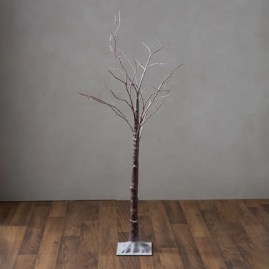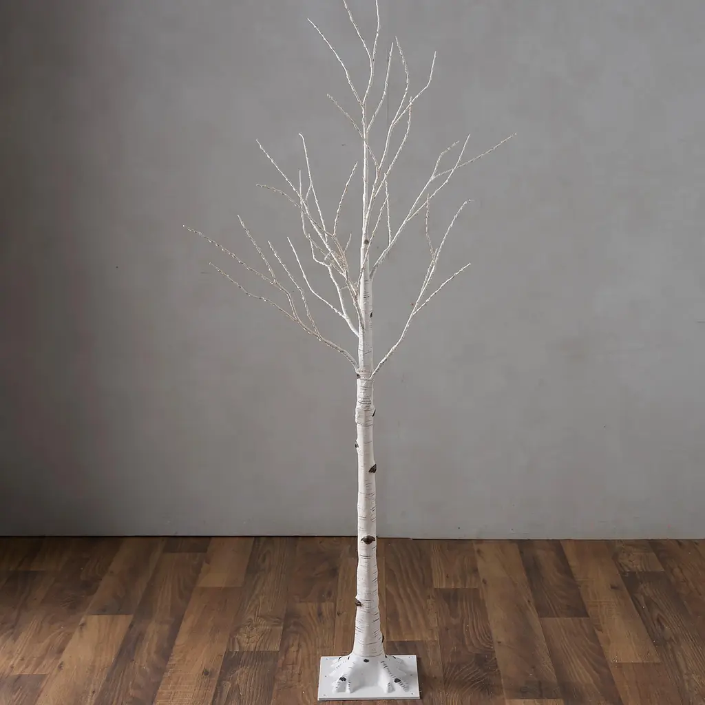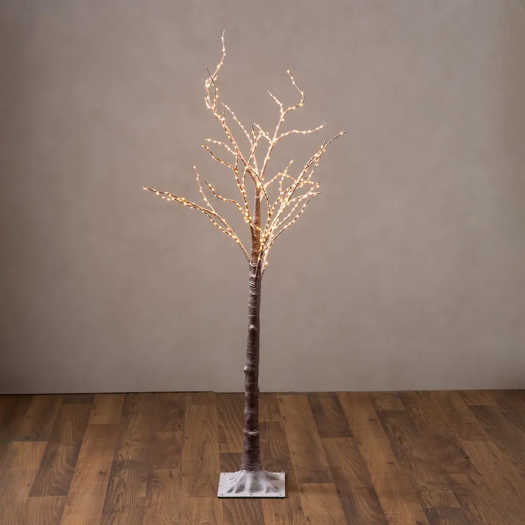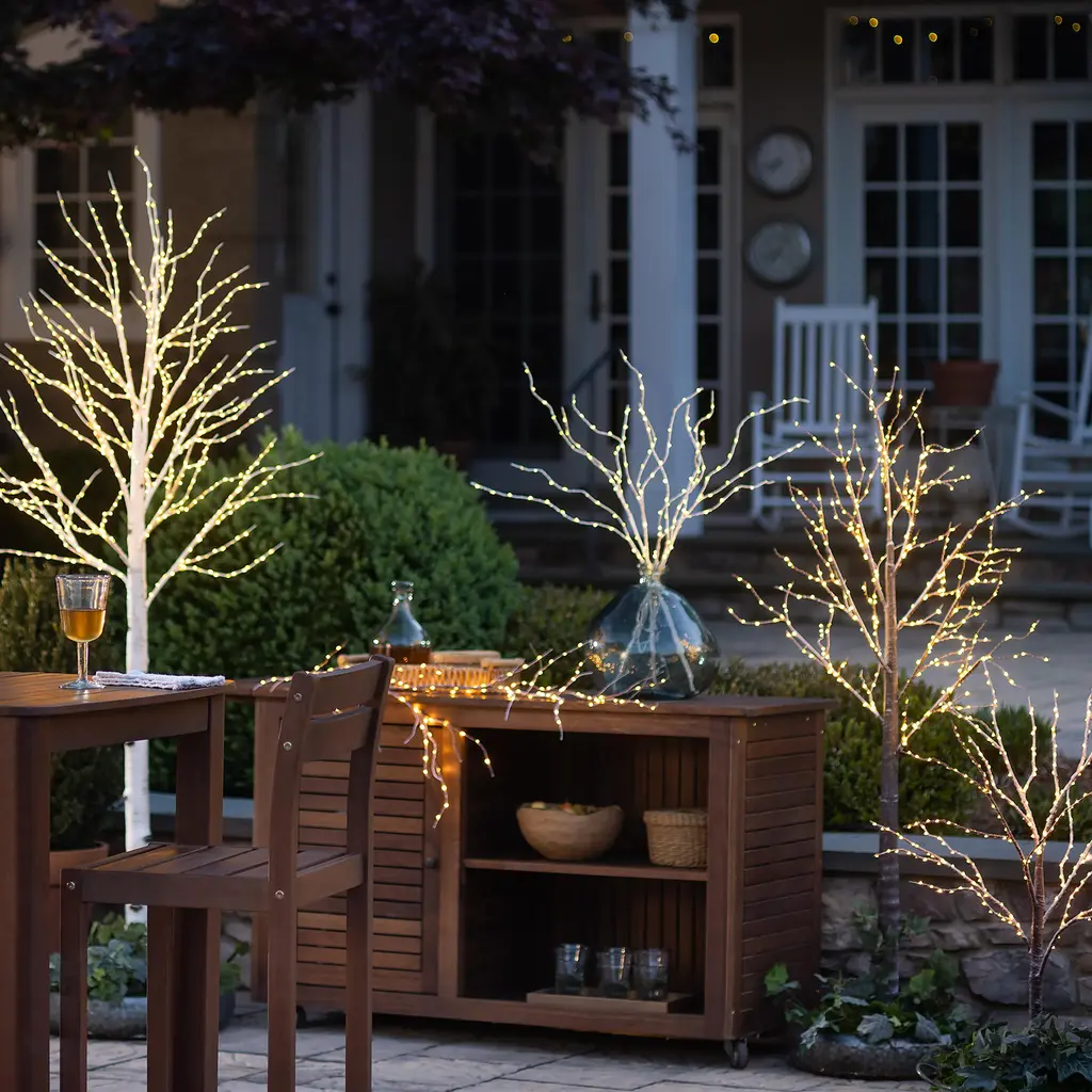 Our Indoor/Outdoor Lighted Birch Tree makes an stunning accent in any season. Simply beautiful, these trees are eye-catching day or night, inside your home or out. The minimalist-style tree is studded with hundreds of warm white micro lights on bendable branches to look gorgeous in your home or as part of your landscape. The graceful, light-wrapped branches are beautiful as-is or they can be lightly decorated with simple ornaments. This tree welcomes the holidays beautifully, but it can also be used as decor all year long. Comes with a removable, square plastic mounting base and four ground stakes. Use as is, or you can wrap the base with burlap or faux snow, place the tree in a pot or decorative container, or stake it into the ground. Brown tree is sprinkled with a dusting of faux snow and has copper wire; White has silver wire. Electric tree has a 16'L lead cord. Size is approximate. Wire and plastic construction for indoors or out. Easy assembly.