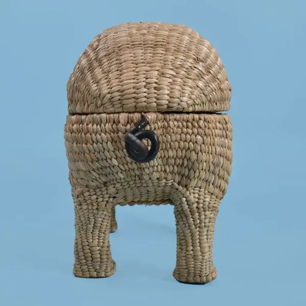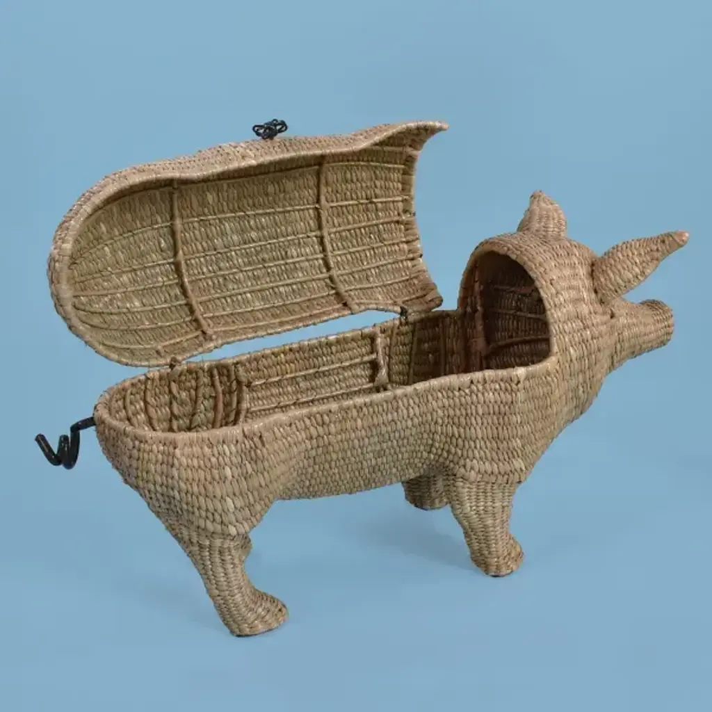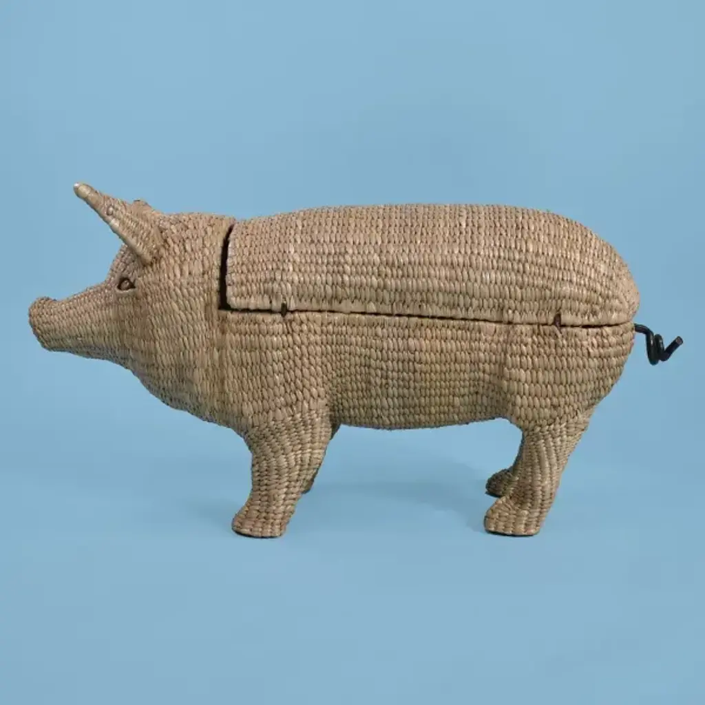 Small Pig Trunk by Mario Lopez Torres. Top opens. There are minor imperfections to the hand-made woven rattan. Signed Mario Lopez Torres Est. 1974. (See Pictures )