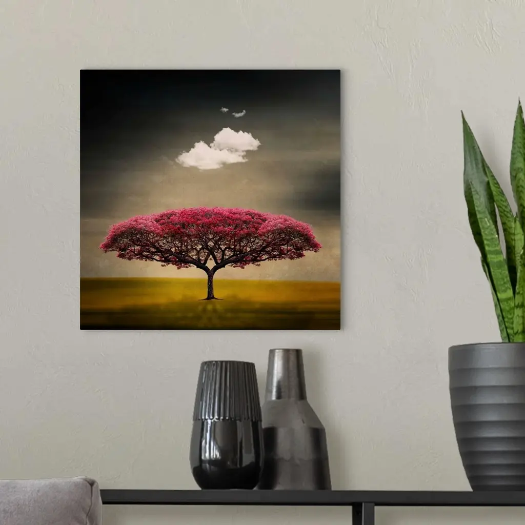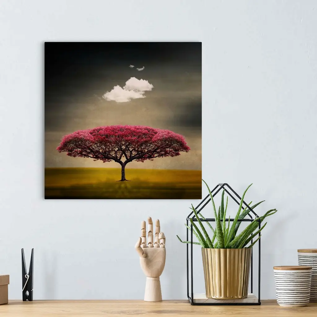 This art work is a digital composite of a symmetrical flowering tree with a fluffy cloud floating above.