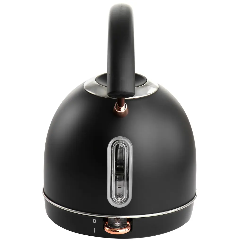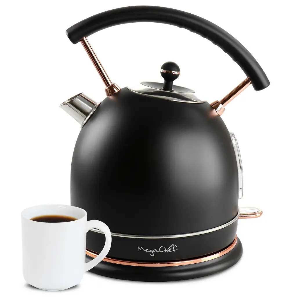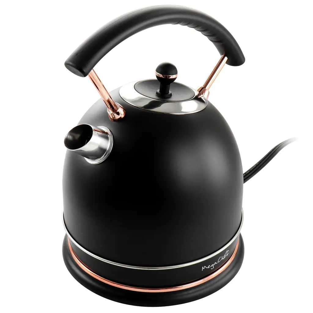 Add a touch of Style and fashion with the MegaChef 1.8 Quart Half Circle Electric Tea kettle in Matte Black with Rose Gold finish. This MegaChef 1.8 Quart Electric Kettle adds a flair of retro style to your kitchen decor. Constructed of premium stainless steel body, spout and removable filter. The 1500 Watts of power rapidly boils water for coffees, teas, cocoas, snacks, soups and much more! Water indicator window lets you see exactly how much to fill and how much hot water you have left for serving. Features boil dry protection, drip free spout and cordless serving. Cord Storage conveniently keeps cord out of sight and your counts clutter free.