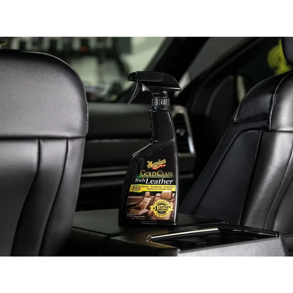 Use Meguiar's Gold Class Rich Leather 3-in-1 formula for a simple but highly effective leather treatment that cleans, conditions and protects in one step. Our spray formula contains gentle cleaners that safely and effectively remove dirt and grime without leaving a white residue or greasy feel. Premium conditioners and aloe nourish leather for a supple look and feel, while UV protection helps to prevent aging, drying, cracking and fading. Gold Class Rich Leather 3-in-1 cleans, conditions and protects in one easy step for complete leather care.