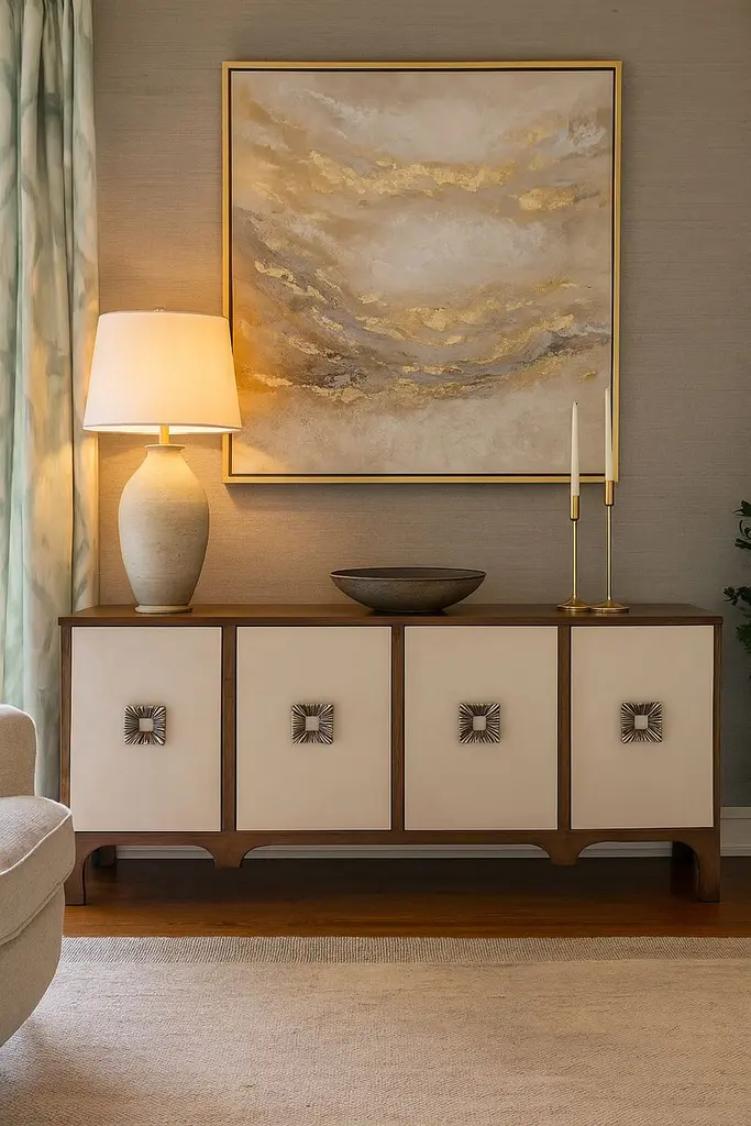 The Mélange credenza has four doors with large square hardware. It can also be used as an entertainment console.A rich wood frame paired with creamy door panels creates a striking contrast, making it a sophisticated piece for any room.