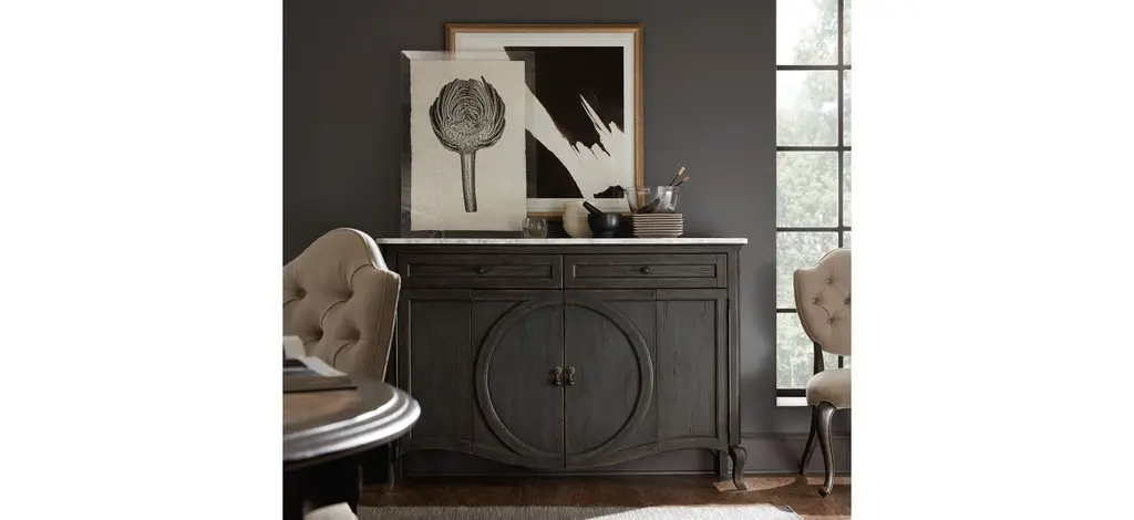 This chic and shapely Melange Four-Door Two-Drawer Credenza has a raised circle motif that dissects the center doors, classic cabriole legs and an elegant marble top. Almost too good to be true: this gorgeous piece is TV-ready with a ventilated back panel, two adjustable shelves and two drawers and will accommodate up to a 60-inch flat screen TV. Finish is a charcoal color.