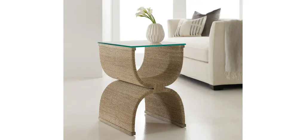In stylish symmetry, the Melange Lenny Woven End Table, crafted in an organic woven rope with a tempered glass top, is a bohemian beauty that will add whimsy and practicality to any chairside.