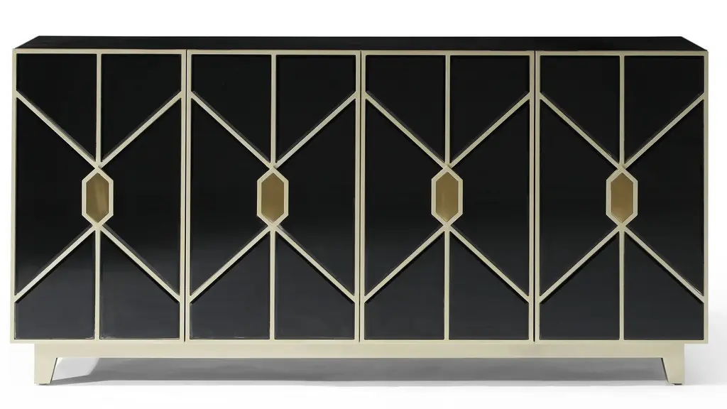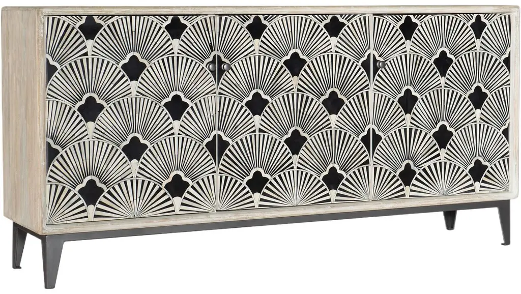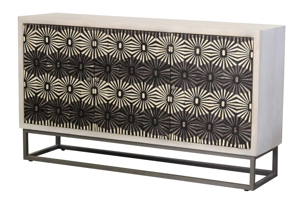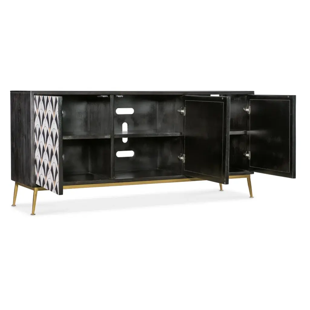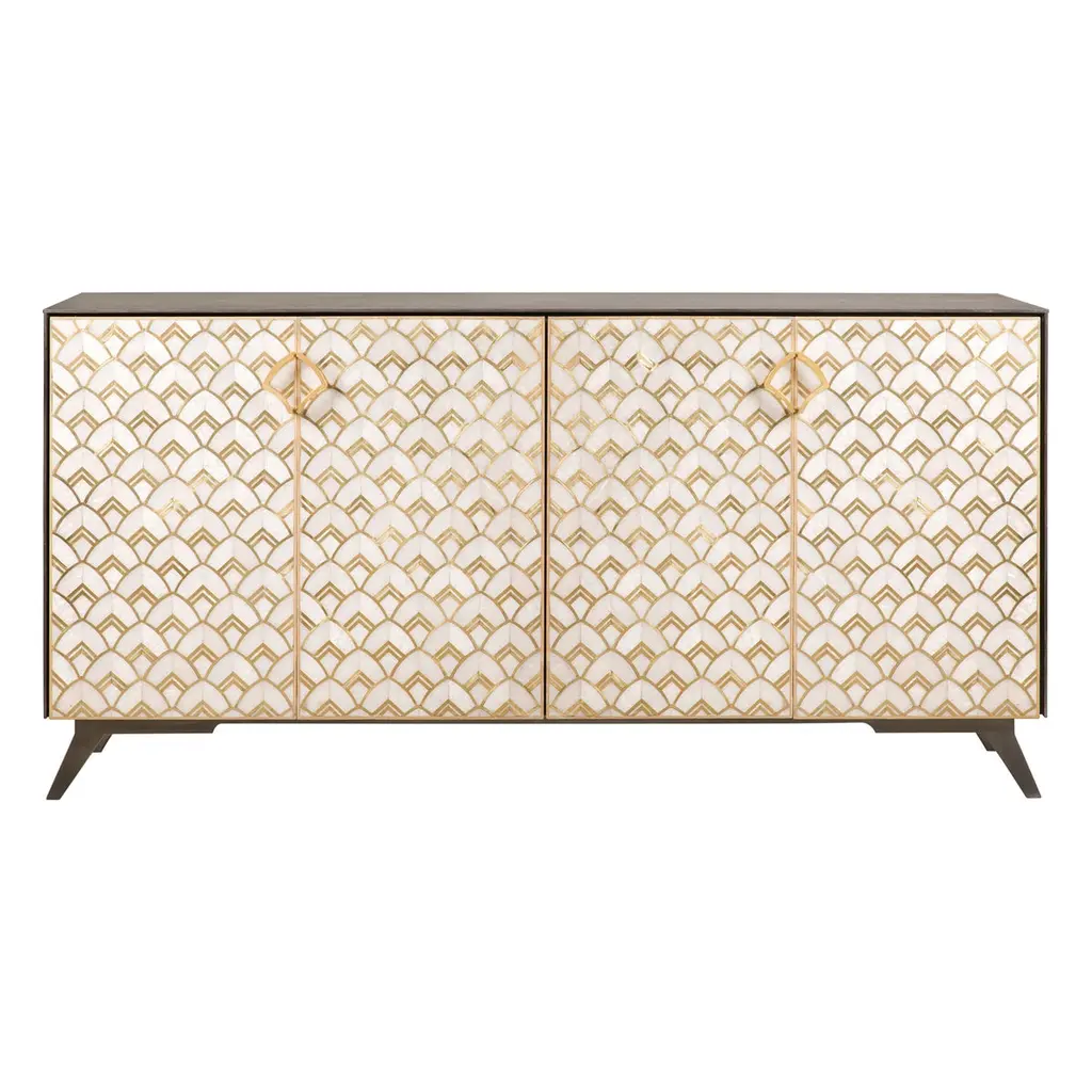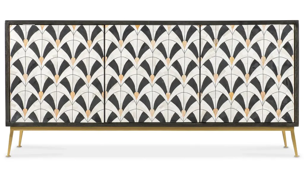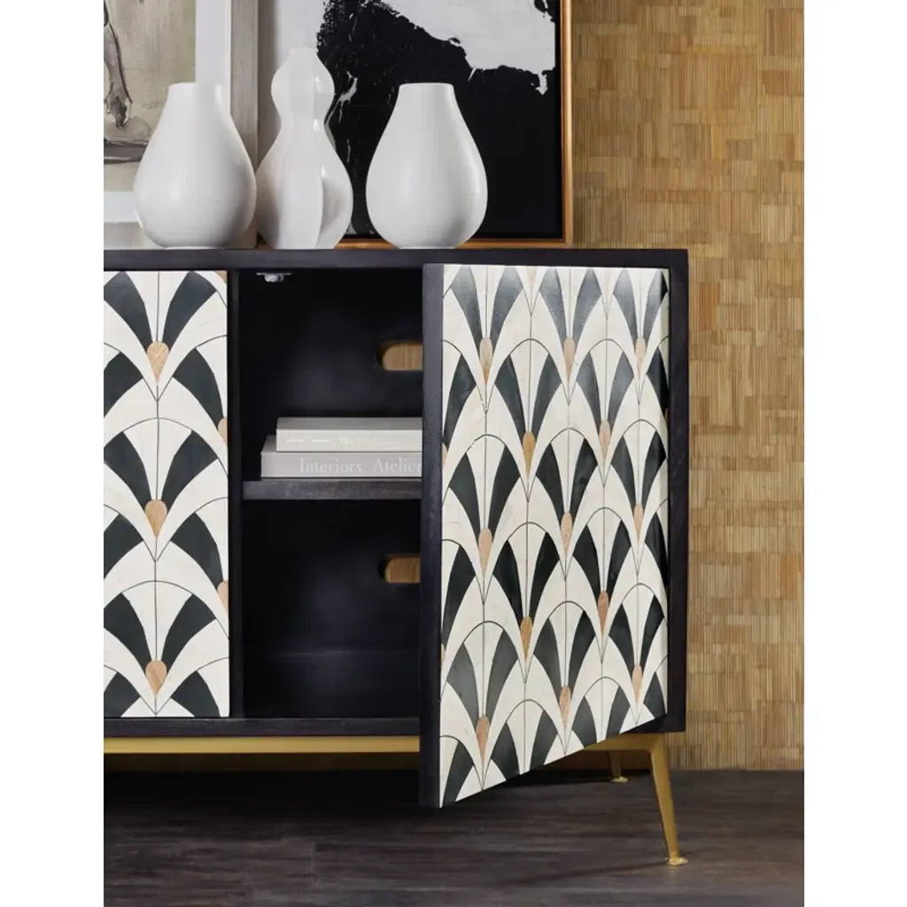 The striking staccato style of the Renee credenza is expressed with a black wood finish accented by beige, brown, and bone inlay on the door fronts. Crafted of mango wood, the credenza has 3 doors with touch latches, one fixed shelf behind each door, and wire management holes in the back. A gold metal base and legs complete the eclectic design.