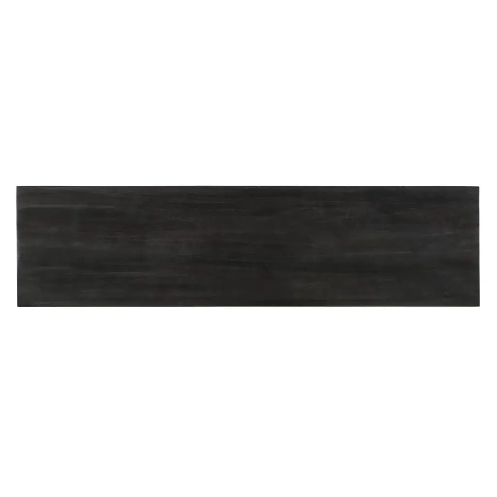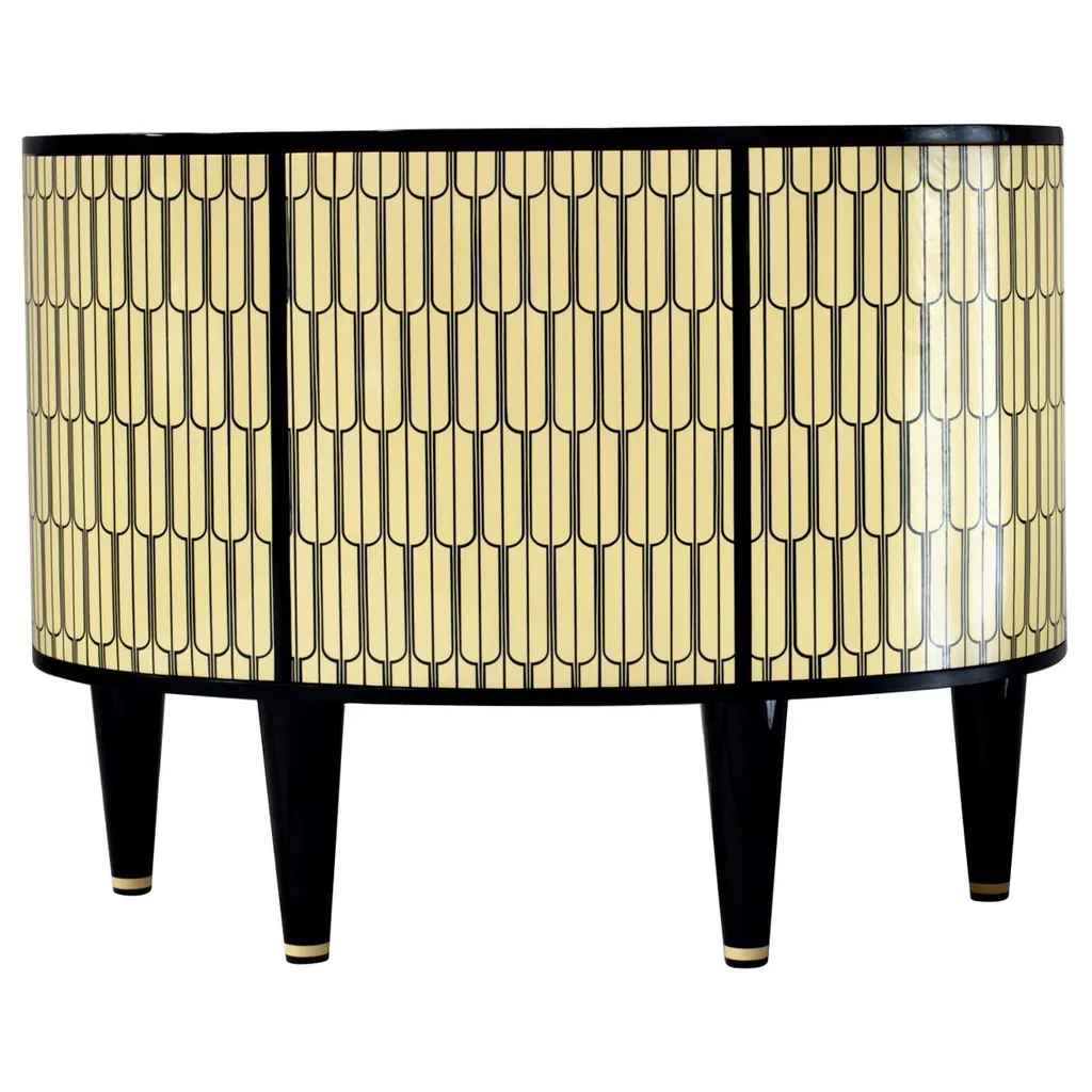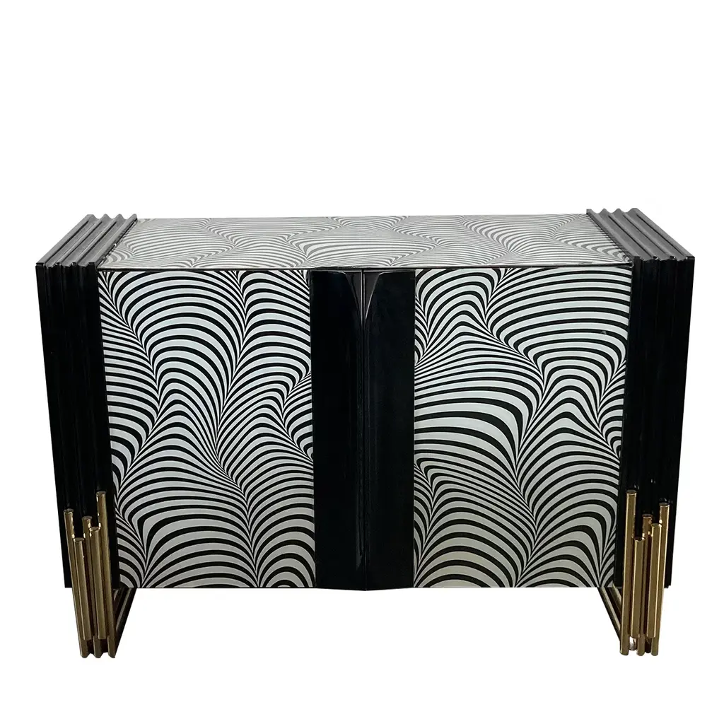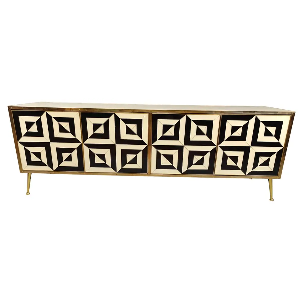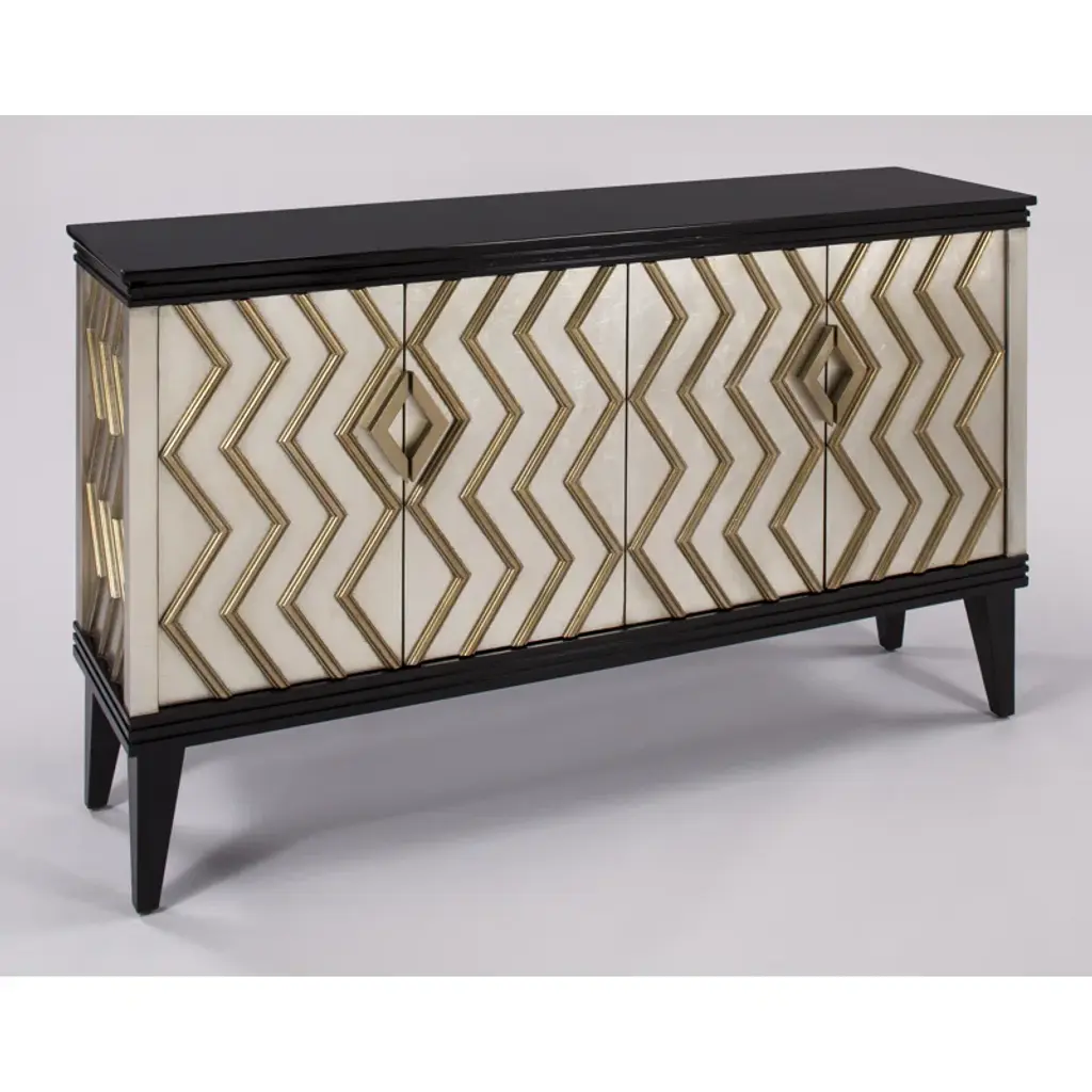 The striking staccato style of the Renee credenza is expressed with a black wood finish accented by beige, brown, and bone inlay on the door fronts. Crafted of mango wood, the credenza has 3 doors with touch latches, one fixed shelf behind each door, and wire management holes in the back. A gold metal base and legs complete the eclectic design.