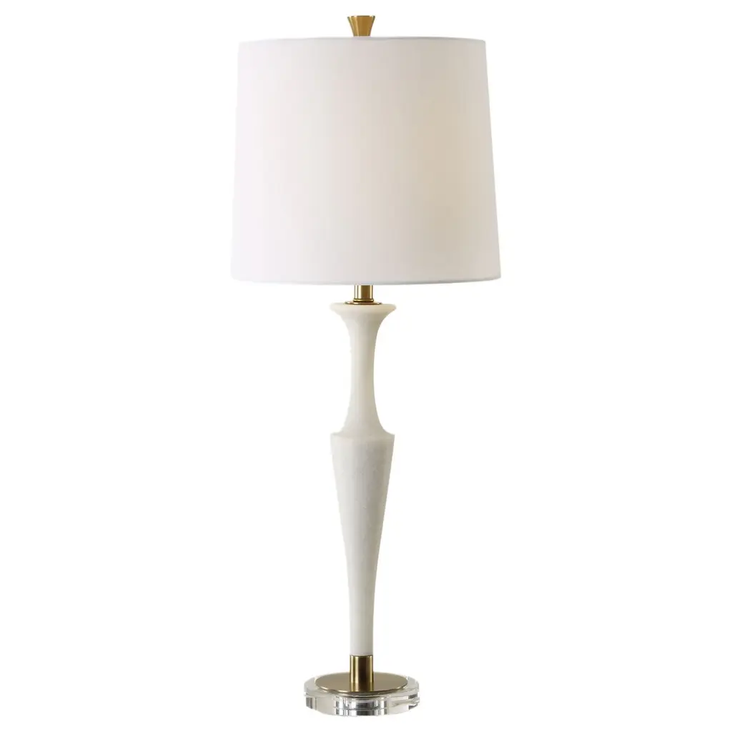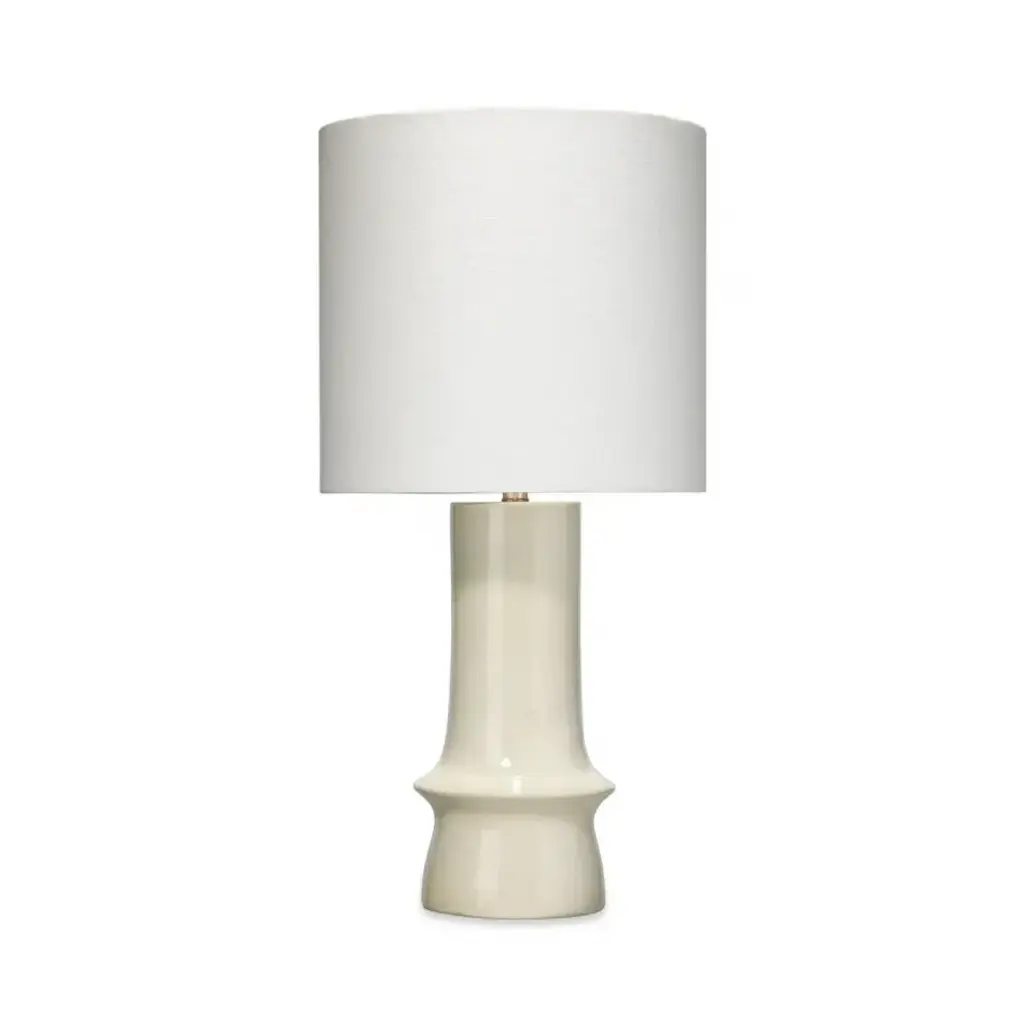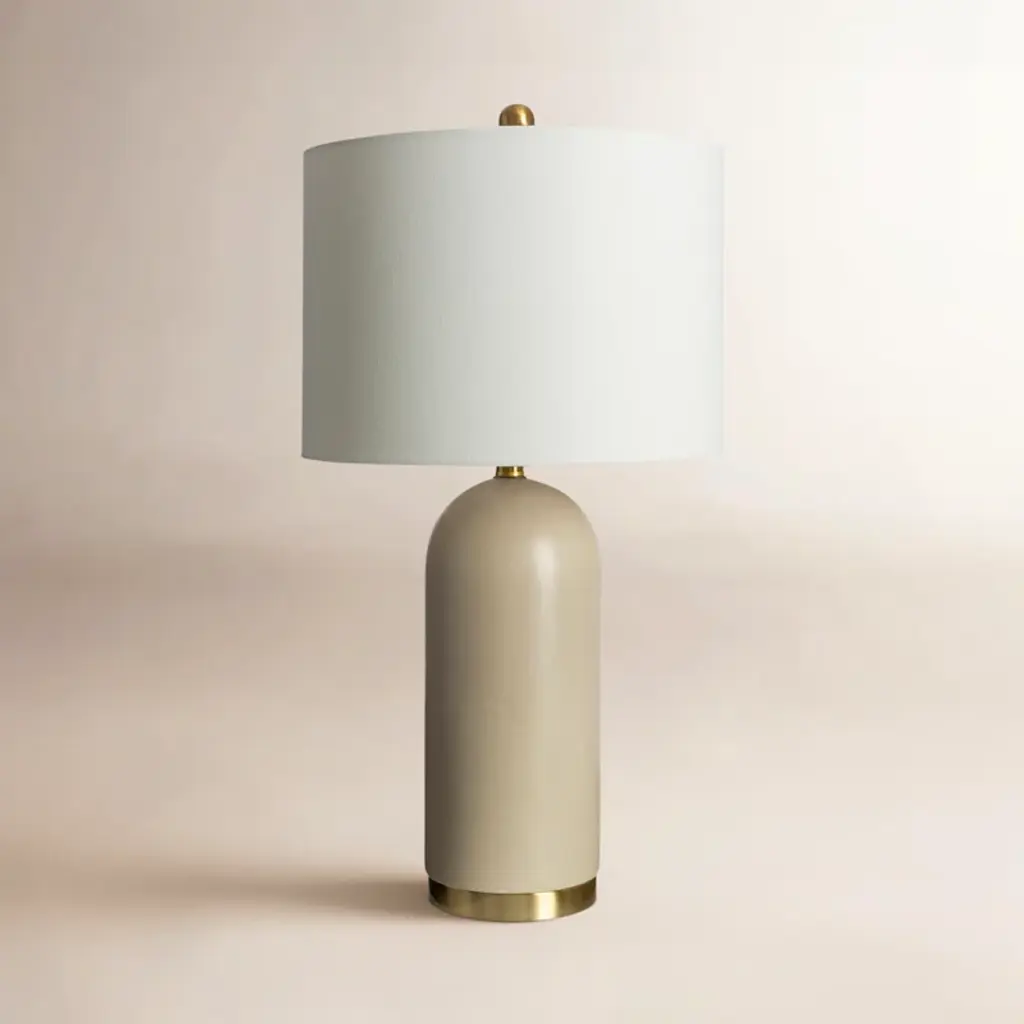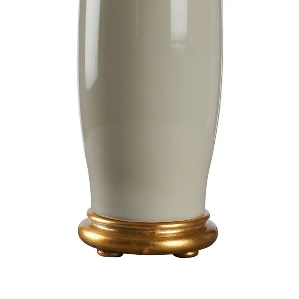 This lovely ceramic lamp exudes sleek sophistication with its smooth, minimalist silhouette. Its elegant gold base adds a touch of luxury, making it a perfect blend of modern style and timeless charm. Designed by Jamie Merida.