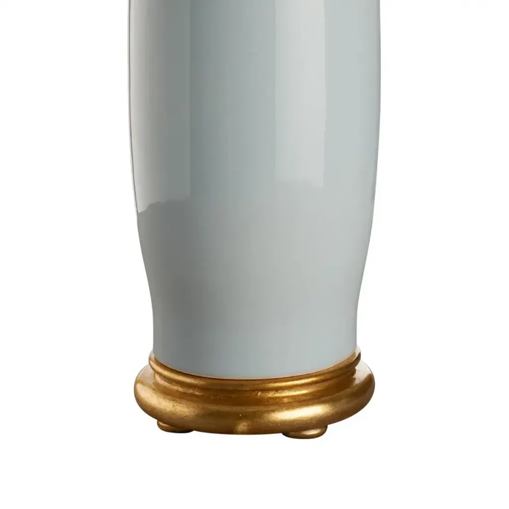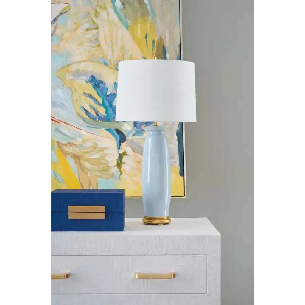 This soft blue ceramic lamp exudes sleek sophistication with its smooth, minimalist silhouette. Its elegant gold base adds a touch of luxury, making it a perfect blend of modern style and timeless charm. Designed by Jamie Merida.