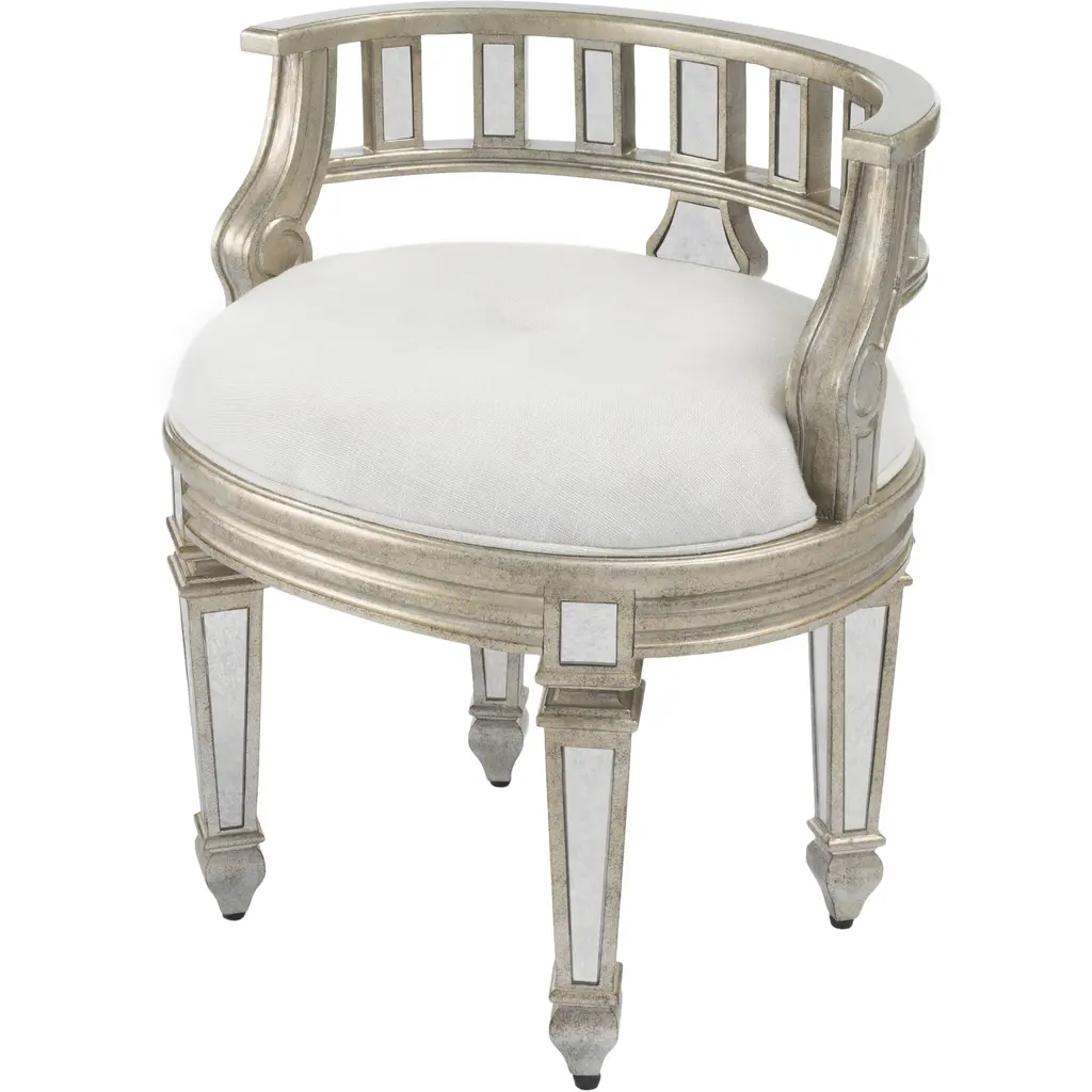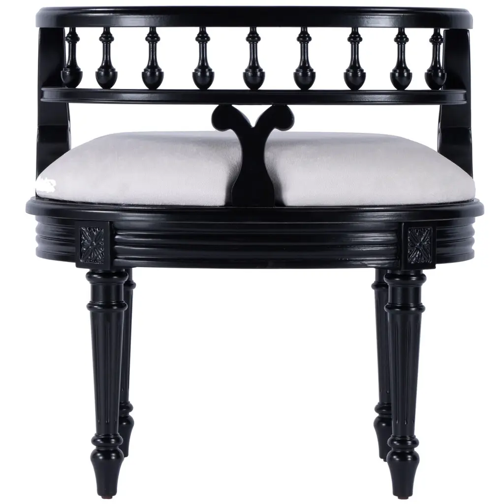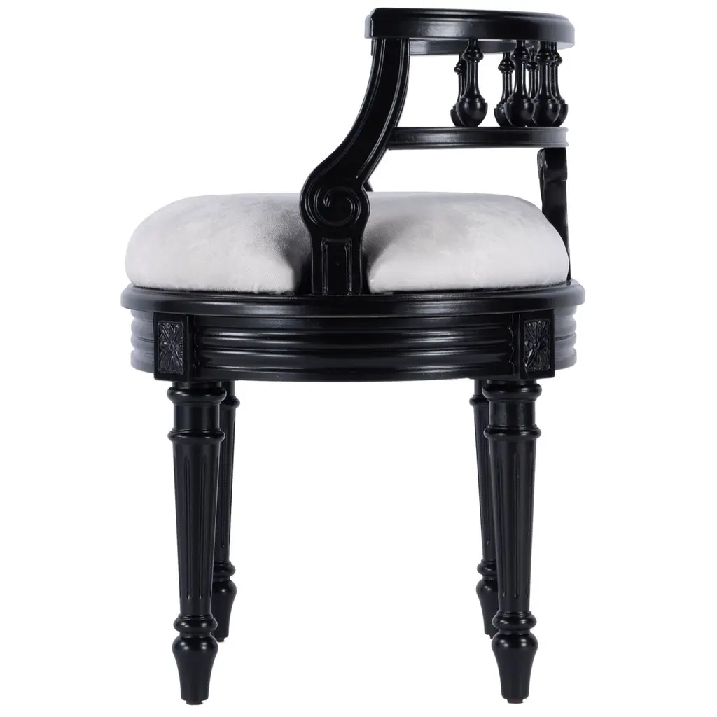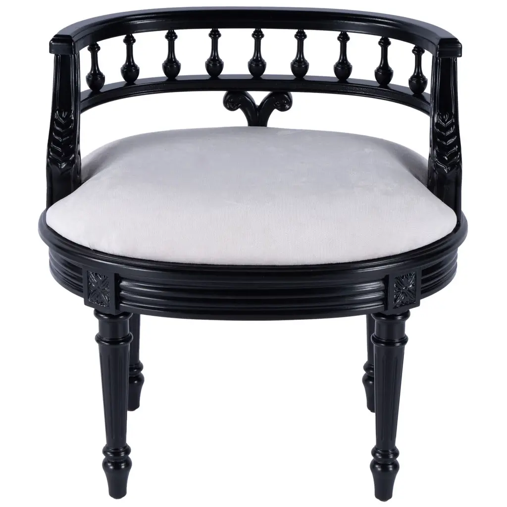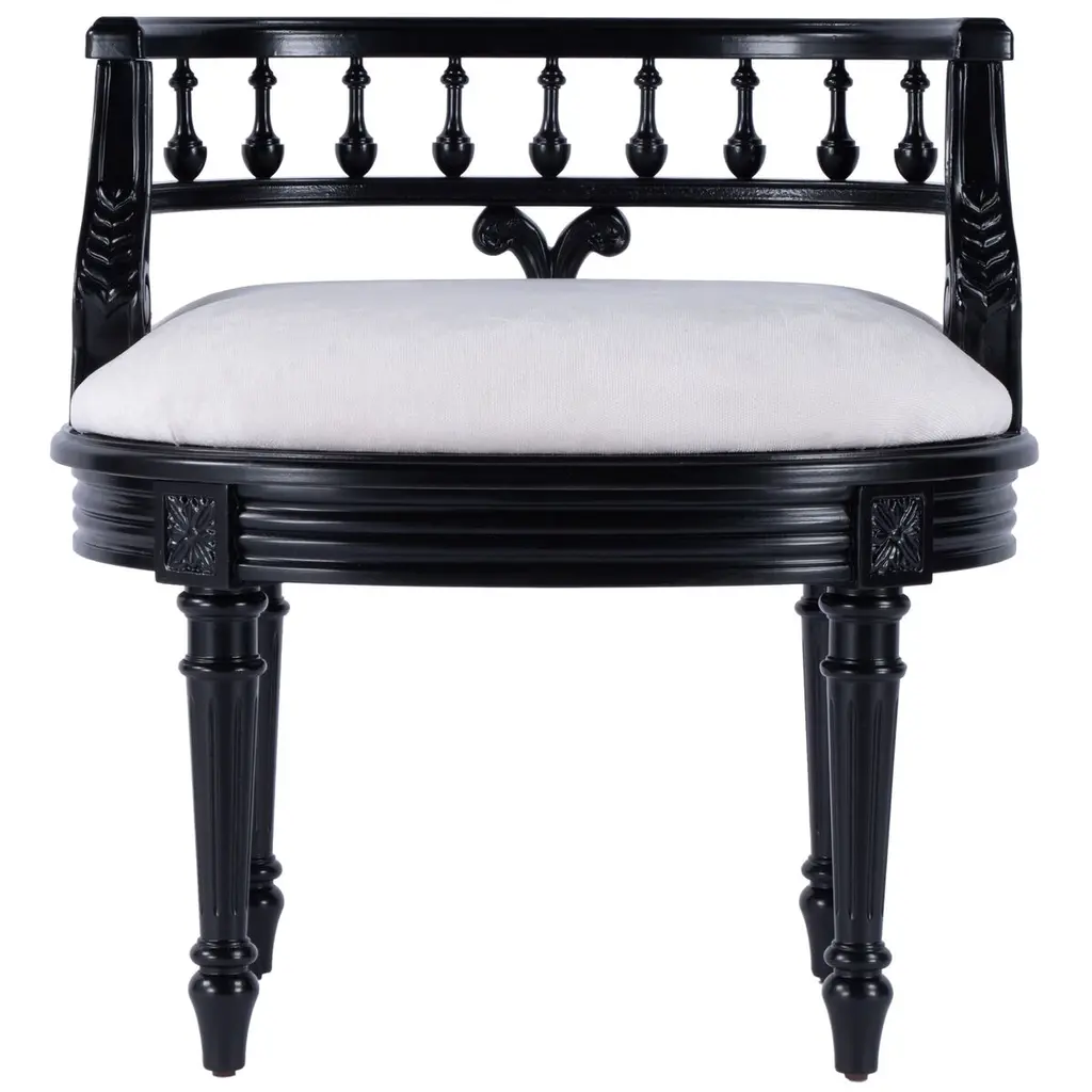 This elegant vanity seat adds formal elegance to any powder or dressing room. Handcrafted from hardwood solids and wood products, it features a carved solid wood back and legs. The generously-sized upholstered seat cushion is covered in a cotton hobnail fabric.