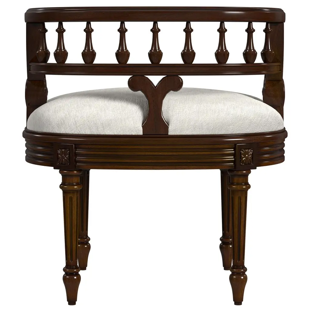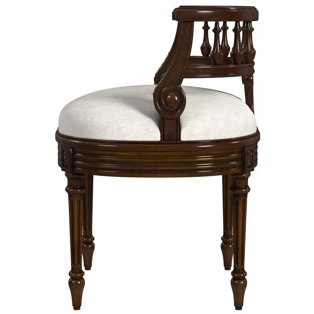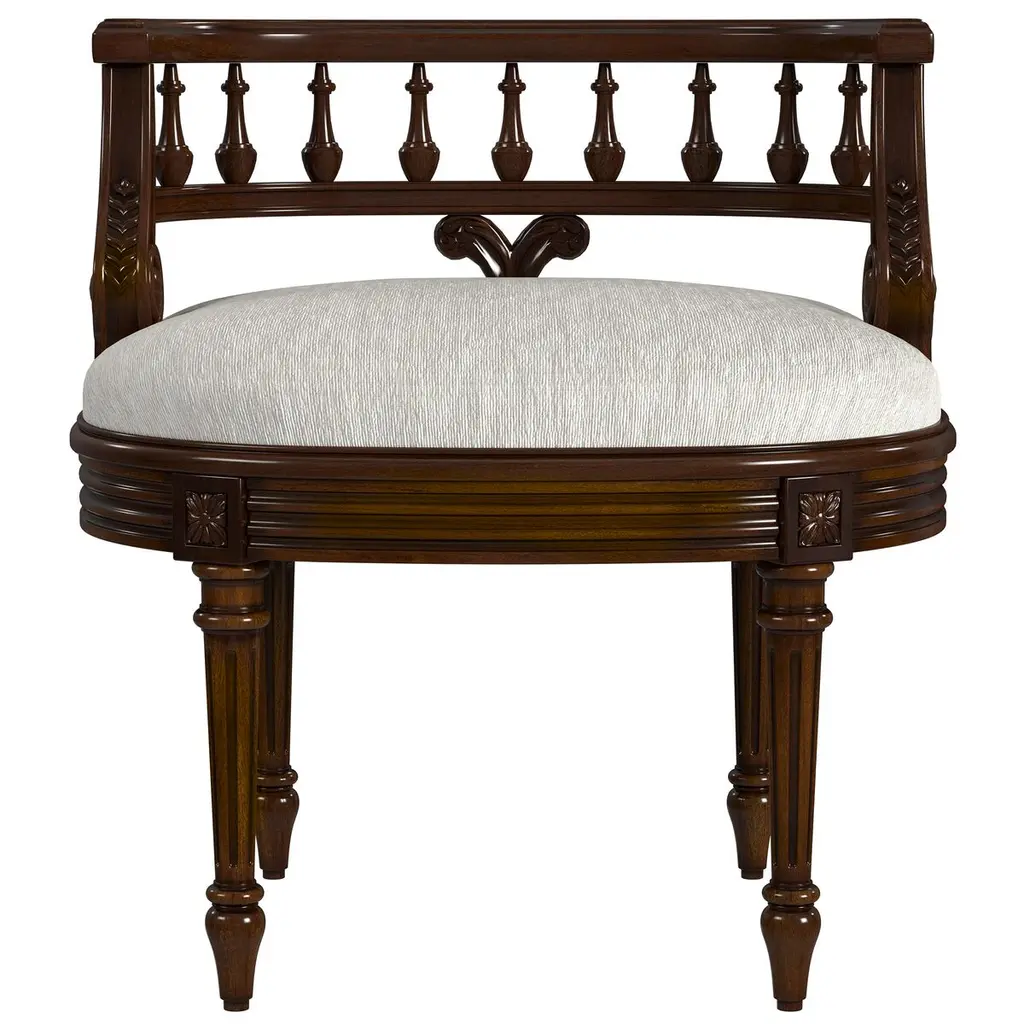 This elegant vanity seat adds formal elegance to any powder or dressing room. Handcrafted from hardwood solids and wood products, it features a carved solid wood back and legs. The generously-sized upholstered seat cushion is covered in a cotton hobnail fabric.