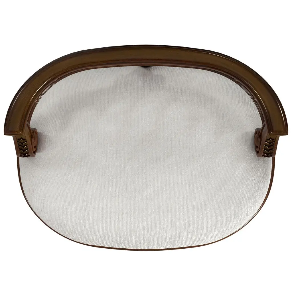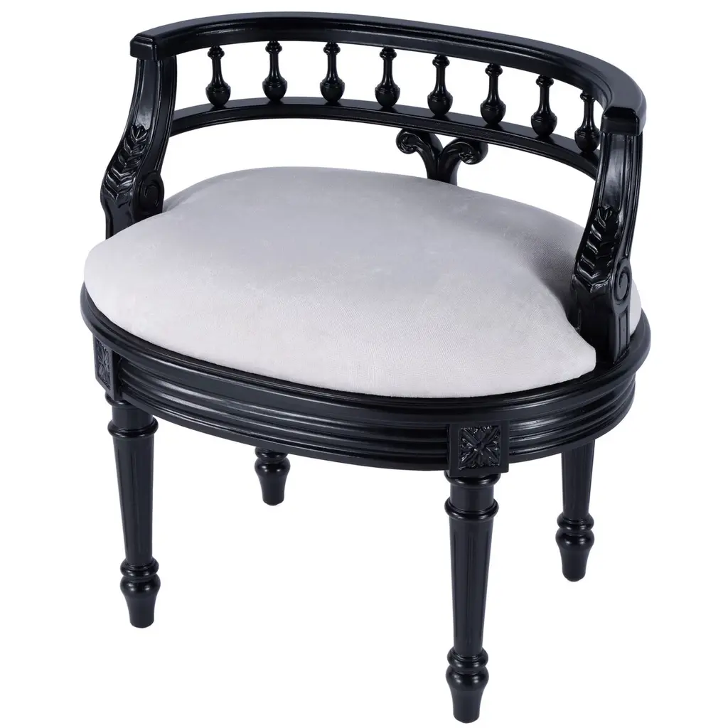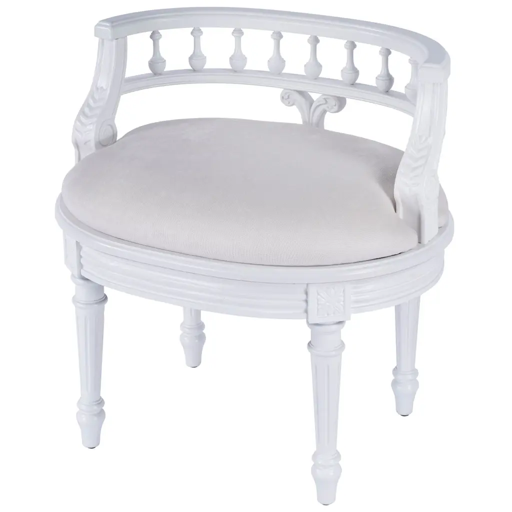 This elegant vanity seat adds formal elegance to any powder or dressing room. Handcrafted from hardwood solids and wood products, it features a carved solid wood back and legs. The generously-sized upholstered seat cushion is covered in a cotton hobnail fabric.