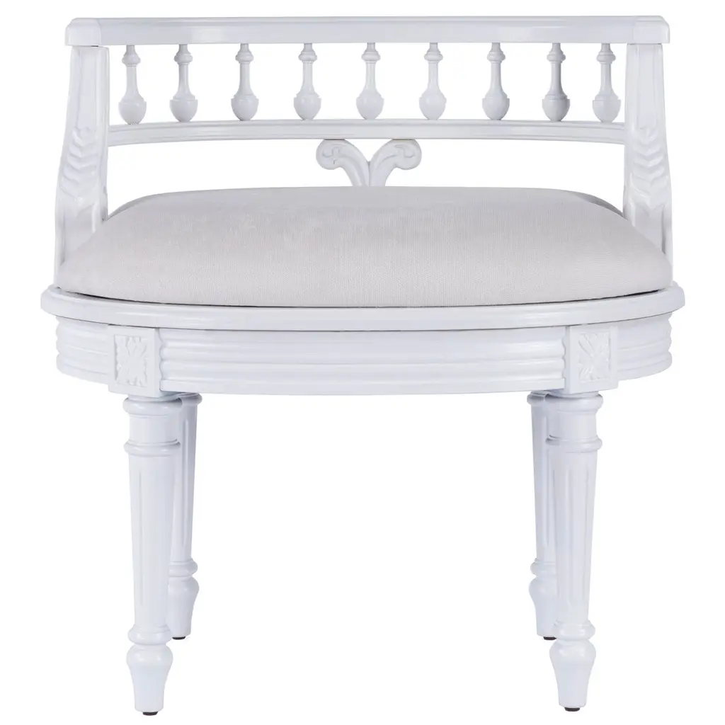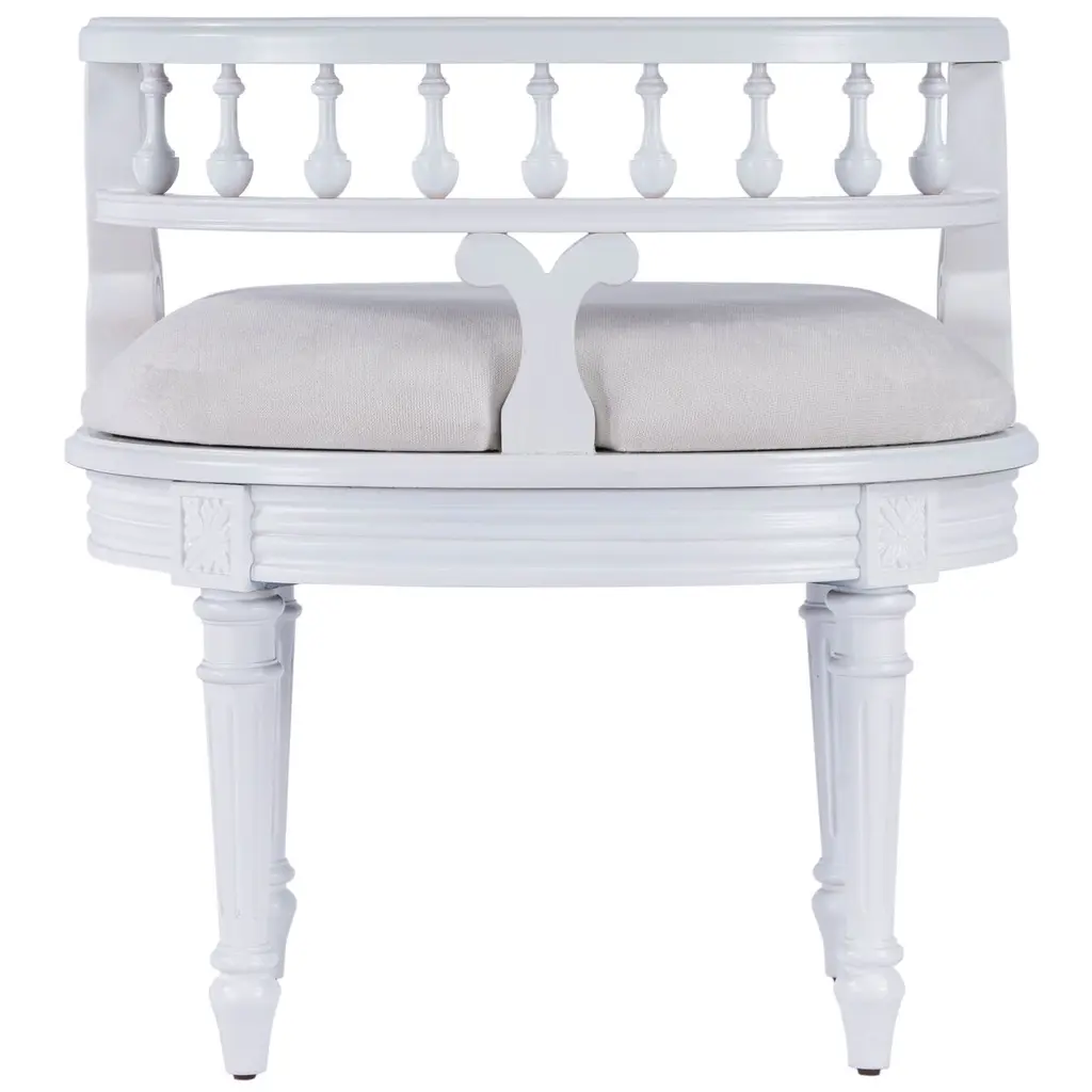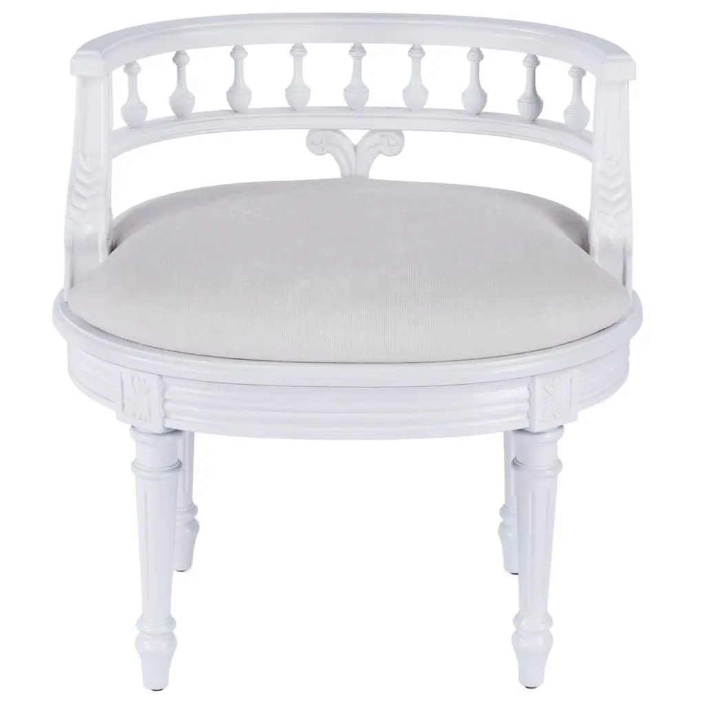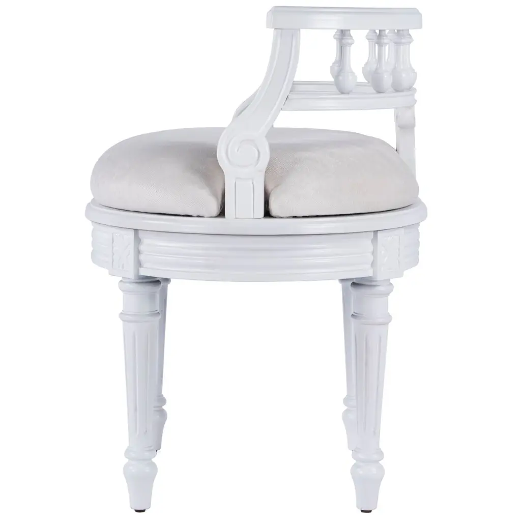 This elegant vanity seat adds formal elegance to any powder or dressing room. Handcrafted from hardwood solids and wood products, it features a carved solid wood back and legs. The generously-sized upholstered seat cushion is covered in a cotton hobnail fabric.