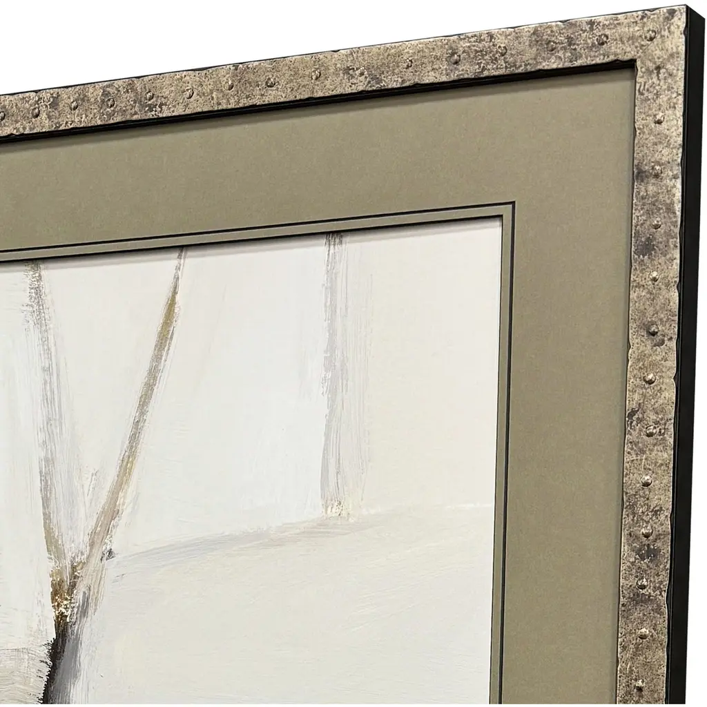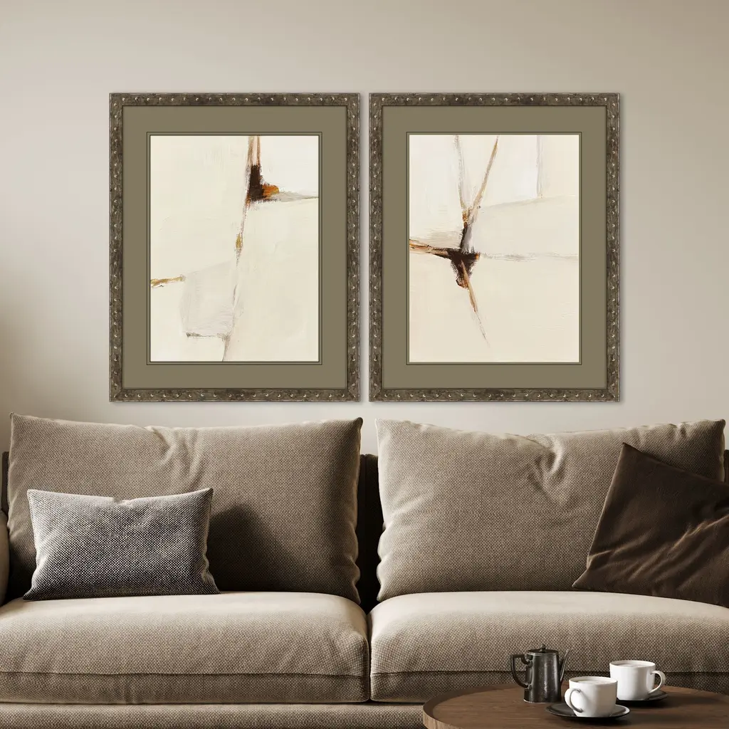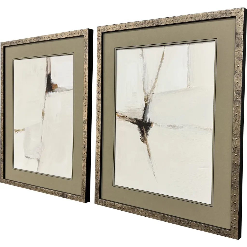 A set of two linear abstract giclees are matted in moss. Framed in a dark wood with antique bronze wash and embossed nail head pattern.
