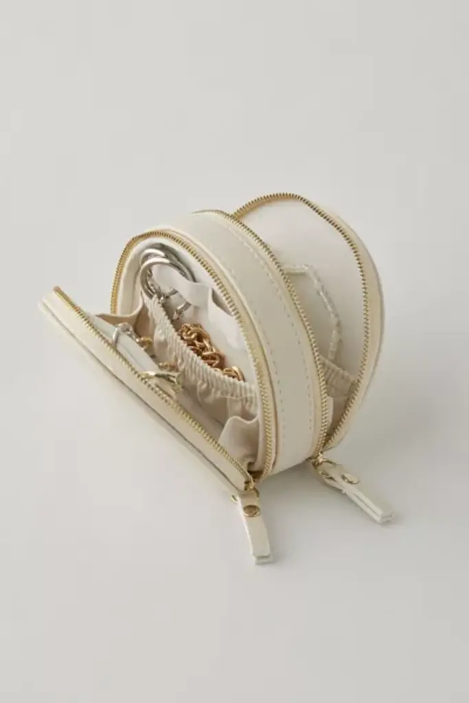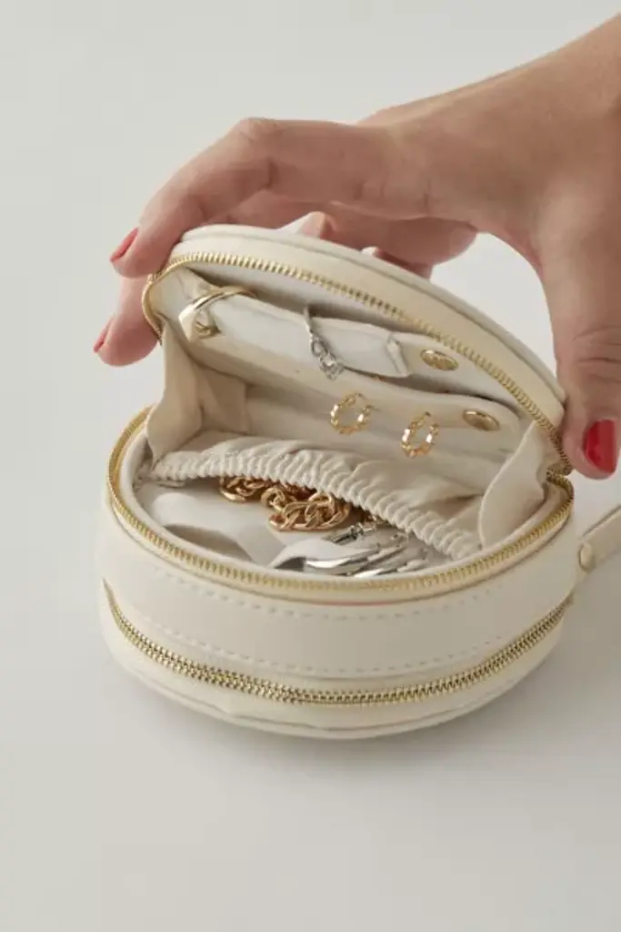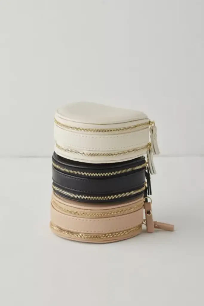 Take your twinkling treasures with you on your travels with this miniature-sized travel jewelry box from Mele and Co Crafted from vegan leather, this jewelry case features a duo of compartments with built-in catch pockets and loops. Lined with anti-tarnish microsuede, this case is equipped with two snap-down straps for your rings and earrings. **Features** \- Mini jewelry case from Mele and Co \- Crafted from vegan leather with microsuede lining \- 2 Compartments topped with zipper closures \- Built-in pockets and jewelry loops \- Snap-down straps for rings and earrings **Content + Care** \- Includes jewelry box, cleaning cloth and reusable dust bag \- Sueded fabric, polyurethane/fiberboard, gold tone \- Wipe clean \- Imported **Size** \- Dimensions: 5"l x 3.75"w x 2"h \- Weight: 0.4 lbs