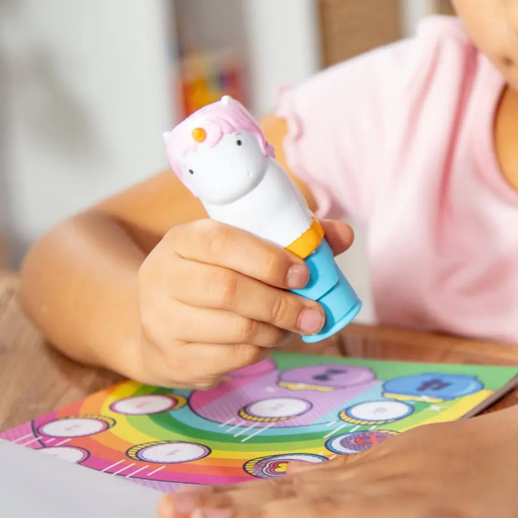Melissa & Doug Sticker WOW!™ is a whole new way to play with stickers! With this two-pack, the adorable, collectible Cocoa the Dog and Cupcake the Unicorn can stamp, stamp, stamp their way through 24 pages of pets-themed and 24 pages of fantasy-themed counting, matching, and search-and-find activities. The refillable sticker stampers come pre-loaded with sticker stacks of 300 assorted stickers – with 100 unique designs in every stack, each sticker is a surprise! Stickers are not reusable, but are easy to remove if necessary. Fill in the activity pages and use for creative art projects, such as bookmarks, posters, cards, and more. Easy-to-remove stickers and the convenient on-the-go format with built-in sticker stamper storage makes Sticker WOW!™ a great mess-free travel activity. Sticker WOW!™ (patent pending) promotes fine motor skills, encourages creative play, and it’s satisfying, fidget fun!