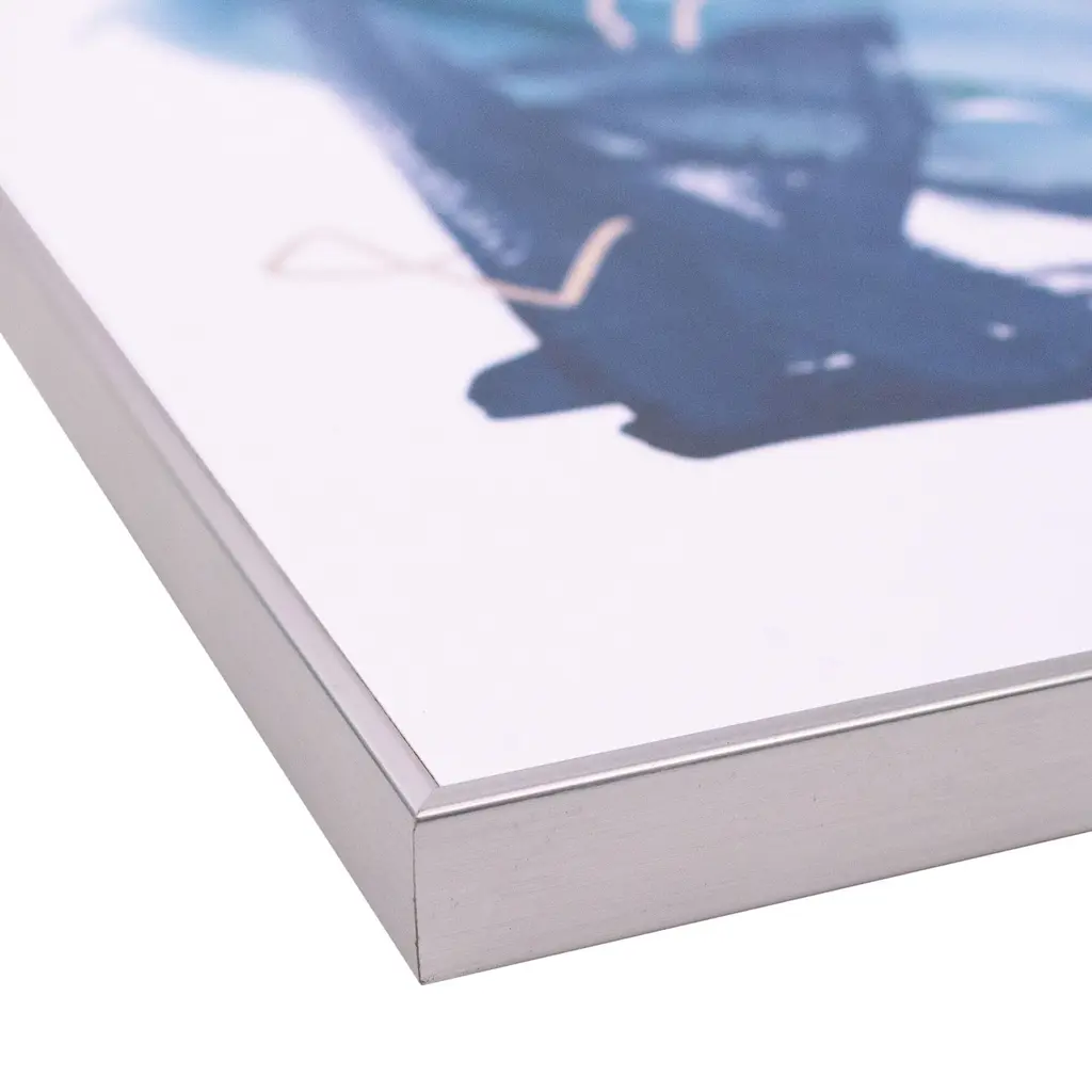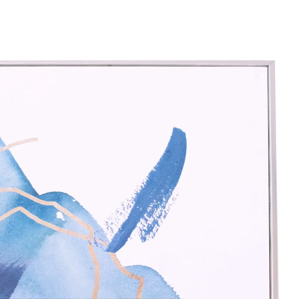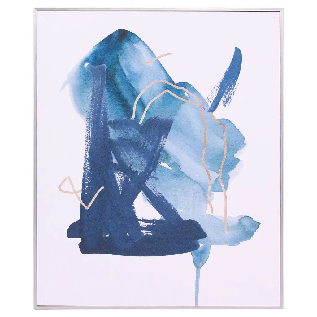 Indigo Collide II by Melissa Wang is an affordable, high quality piece of framed art. The finished size is 13.5W x 16.5H x 1D with a thin silver metallic frame . It has an attached sawtooth hanger for easy installation.